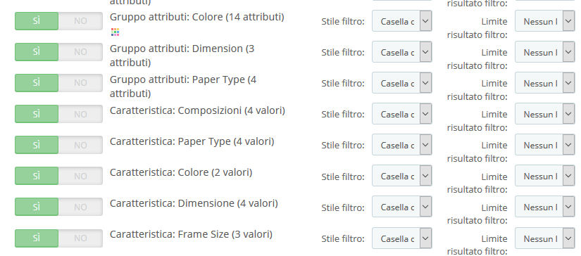 PER VOLVY = Con la 1.6.0.13 il filtro funziona sia con attributi che con caratteristiche che poi mi appaiono nella scheda prodotto... quindi mi aspettavo che anche con la nuova versione funzionasse con entrambi. Se ho un articolo in cotone con diverse taglie (le taglie sono attributi - e la composizione in cotone è caratteristica). Il cliente deve filtrare sia con taglie che con composizione.