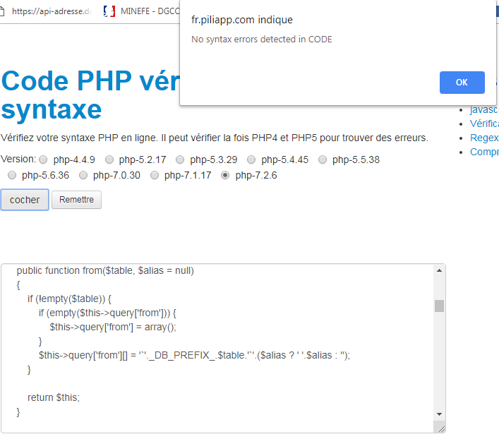 Eolia Posted January 21, 2019 Share Posted January 21, 2019 Prestashop 1.6.1.23 => Version PHP MAXI: 7.1 et encore, toutes les lignes n'ont pas été corrigées quoi qu'en disent certains tant qu'ils ne sont pas tombés sur ces fonctions... Dans votre cas cela devrait être public function from($table, $alias = null) { if (!empty($table)) { if (empty($this->query['from'])) { $this->query['from'] = array(); } $this->query['from'][] = '`'._DB_PREFIX_.$table.'`'.($alias ? ' '.$alias : ''); } return $this; } Link to comment Share on other sites More sharing options...
