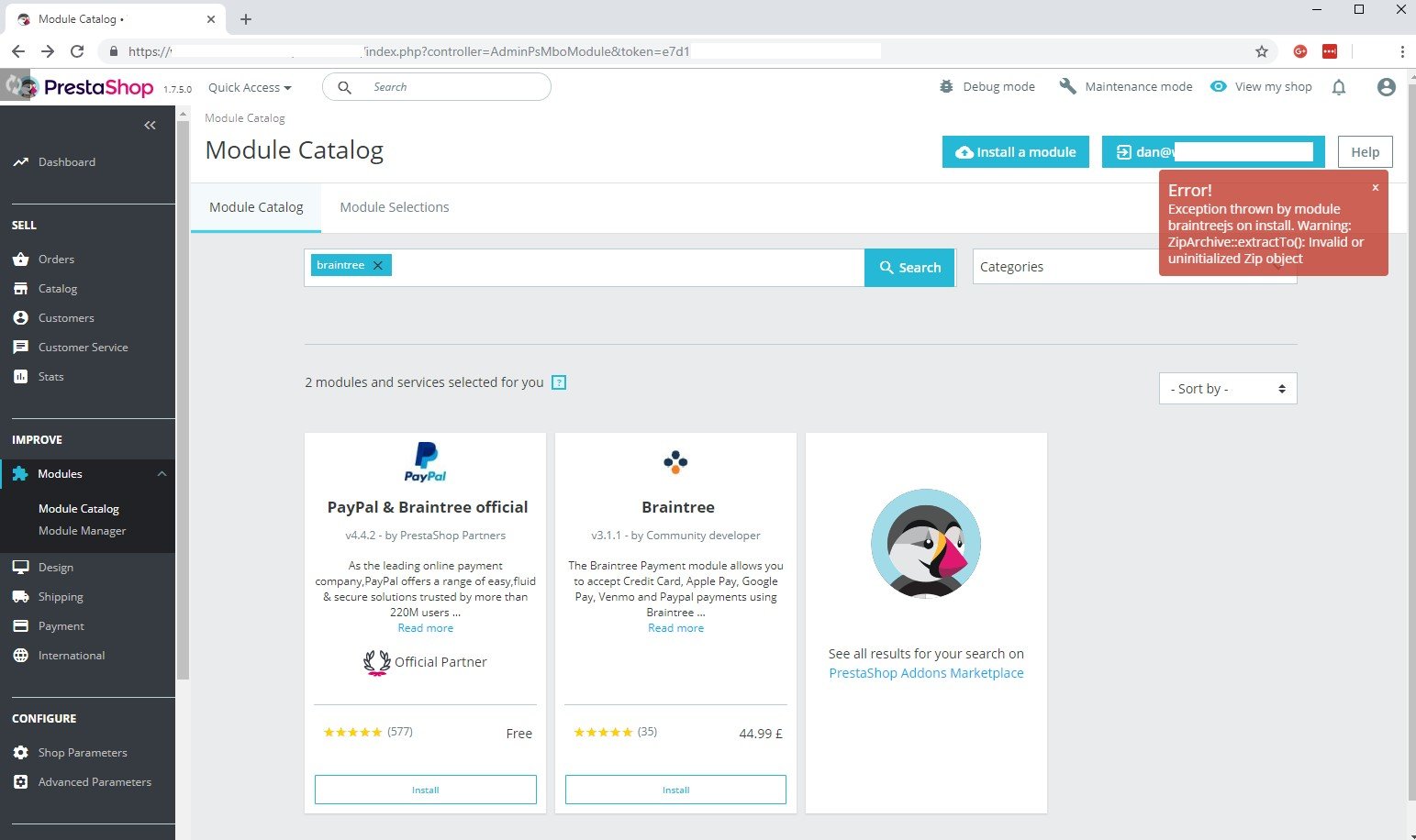 danrimer Posted January 23, 2019 Share Posted January 23, 2019 Hello I am a long time user of Prestashop. I am trying to migrate my store from 1.6 to 1.7 and have stumbled across this problem at the first step! I can't install modules that I have purchased from the addons website on my new server using the backoffice. If I go to the addons website and download them, I can then install them manually without problems. However, I would like to know where the problem lies so that it can be fixed! The image attached shows the error I receive when I try to install the BrainTree payments module that I have purchased. The error message is: "Error! Exception thrown by module braintreejs on install. Warning: ZipArchive::extractTo(): Invalid or uninitialized Zip object". I have tested the server using phpinfo() and zip support is included. Zip Zip enabled Zip version 1.15.4 Libzip version 1.1.2 If it helps, I have a dedicated server running cPanel with PHP 7.2, although my current site isn't residing on this server. Also, the test site has a different URL to the normal site - could this be the reason that the addons aren't being downloaded? I'm unsure where to go next. If anyone can point me in the right direction or if there's a better forum for this problem, please let me know! Thanks Dan Link to comment Share on other sites More sharing options...