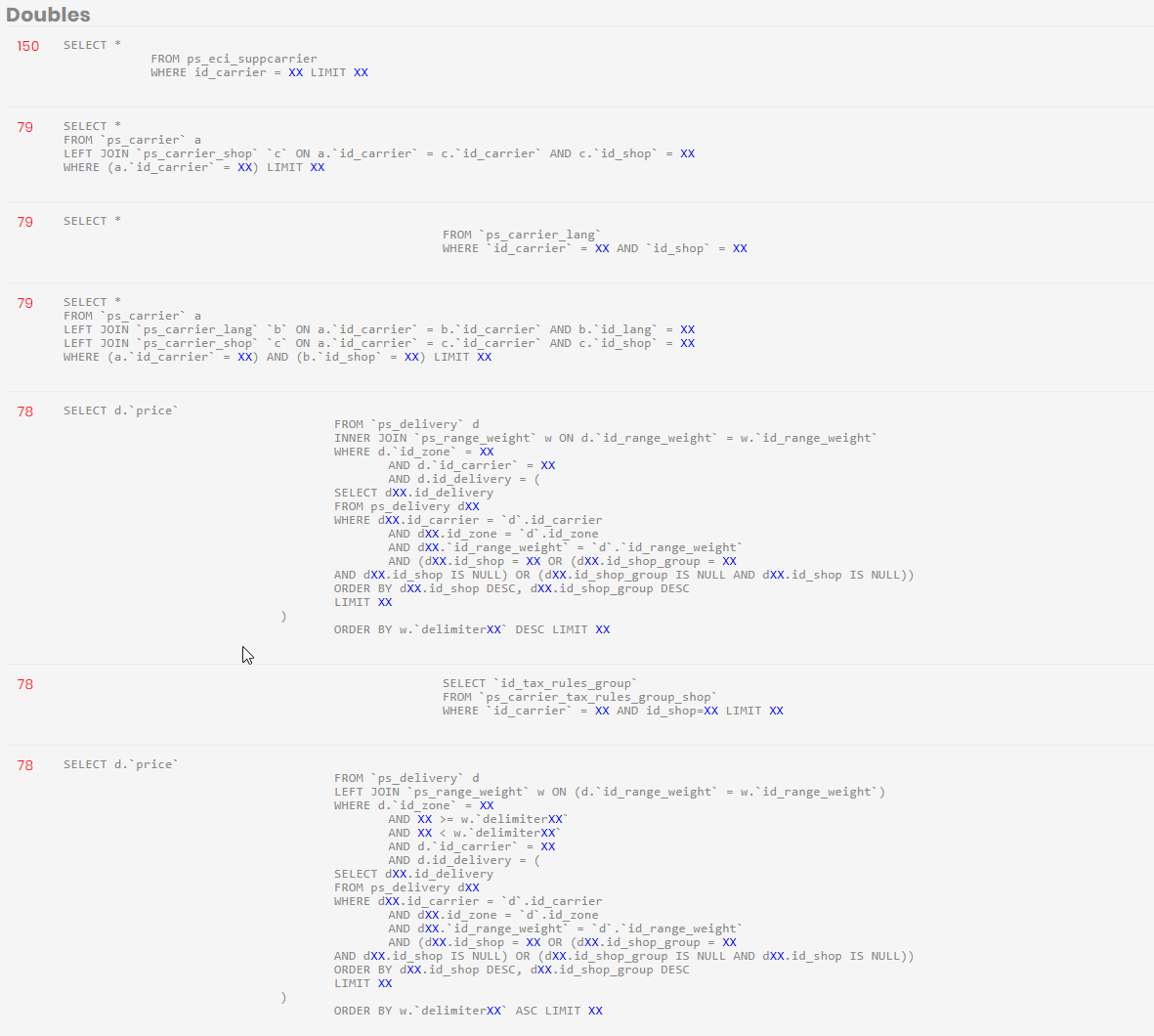 RBSI Posted January 25, 2019 Share Posted January 25, 2019 (edited) Bonjour, Je poste rarement sur les forums mais là... je bloque sévèrement. Voici quelques infos avant d'expliquer le soucis: Version de PS : 1.7.4.2 Hébergement : VPS OVH Version de PHP : 7.2 Version de MySQL : 5.5 Compilation des templates: Jamais Cache Smarty: Non Smart cache: CSS / JS Optimisation Apache: Oui Cache: Non Le site est globalement rapide (< 2 secondes pour l'affichage) SAUF si on s'y connecte en tant que client, alors là on passe sur du 8 à 12 secondes d'attente pour le TTFB. Côté BO aucun problème, c'est vraiment côté FO. Désactiver tous les modules non développés par Prestashop NOK Jouer avec les différents réglages dans "Perfomances" NOK PS_DEBUG_PROFILING à true Si connecté: 11200ms - Stopwatch SQL - 3203 queries Si non conncté: 640ms - Stopwatch SQL - 951 queries Donc j'en déduis que le soucis vient du nombre de requêtes SQL réalisée lorsqu'on est connecté. Parmi les 3203 requêtes je note pas mal de doublon (jusqu'à 150 fois la même requête) : Bref je patoge un peu pour le coup... Je me concentre sur le côté SQL mais c'est peut être totalement autre chose. Des pistes pour me filer un petit coup de main ? Merci d'avance, Benjamin Edited January 27, 2019 by RBSI (see edit history) Link to comment Share on other sites More sharing options...
