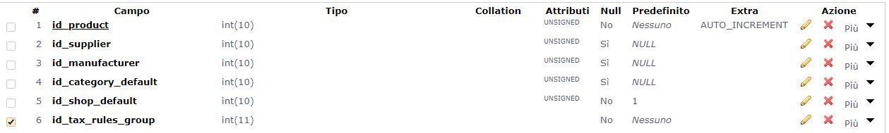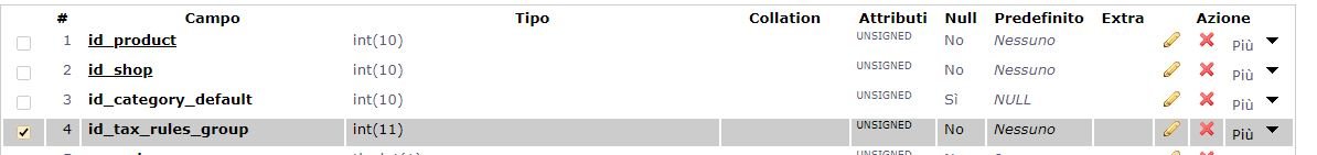 Giuseppe C. Posted January 31, 2019 Share Posted January 31, 2019 Ciao Manu, le immagini riguardano la struttura della tabella... quelle richieste sono relative ai dati presenti nella tabella con filtro id_product relativo al prodotto modificato.In questo modo vediamo quale id_tax_rules_group viene applicato. Es. Cmq se adesso non funziona il salvataggio prova a ripristinare il backup (come consigliato di fare) delle tabelle modificate. Hai effettuato qualche aggiornamento di Prestashop? Link to comment Share on other sites More sharing options...