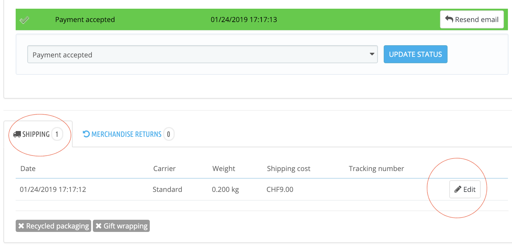 paulgeneva Posted January 30, 2019 Share Posted January 30, 2019 Hello, I'm new to Prestashop program. I'd like to ask you a favor to help me. Problem) I'm not able to input tracking number in BO. 1. In carrier configuration, Tracking URL is correctly inputed (image ps1) 2. In customer's order, Shipping, trid to click "Edit" to input tracking number, but tracking number box doesn't appear(image ps2). 3. When I put curser to Edit, a url show like this " http://example.com/adminxxx/index.php?controller=AdminOrders&id_order=230&vieworder&token=5d4836c50d6cf5034e8a671d178e6f7f#" Would you know what may be problem please ? Thanks for your help. Link to comment Share on other sites More sharing options...