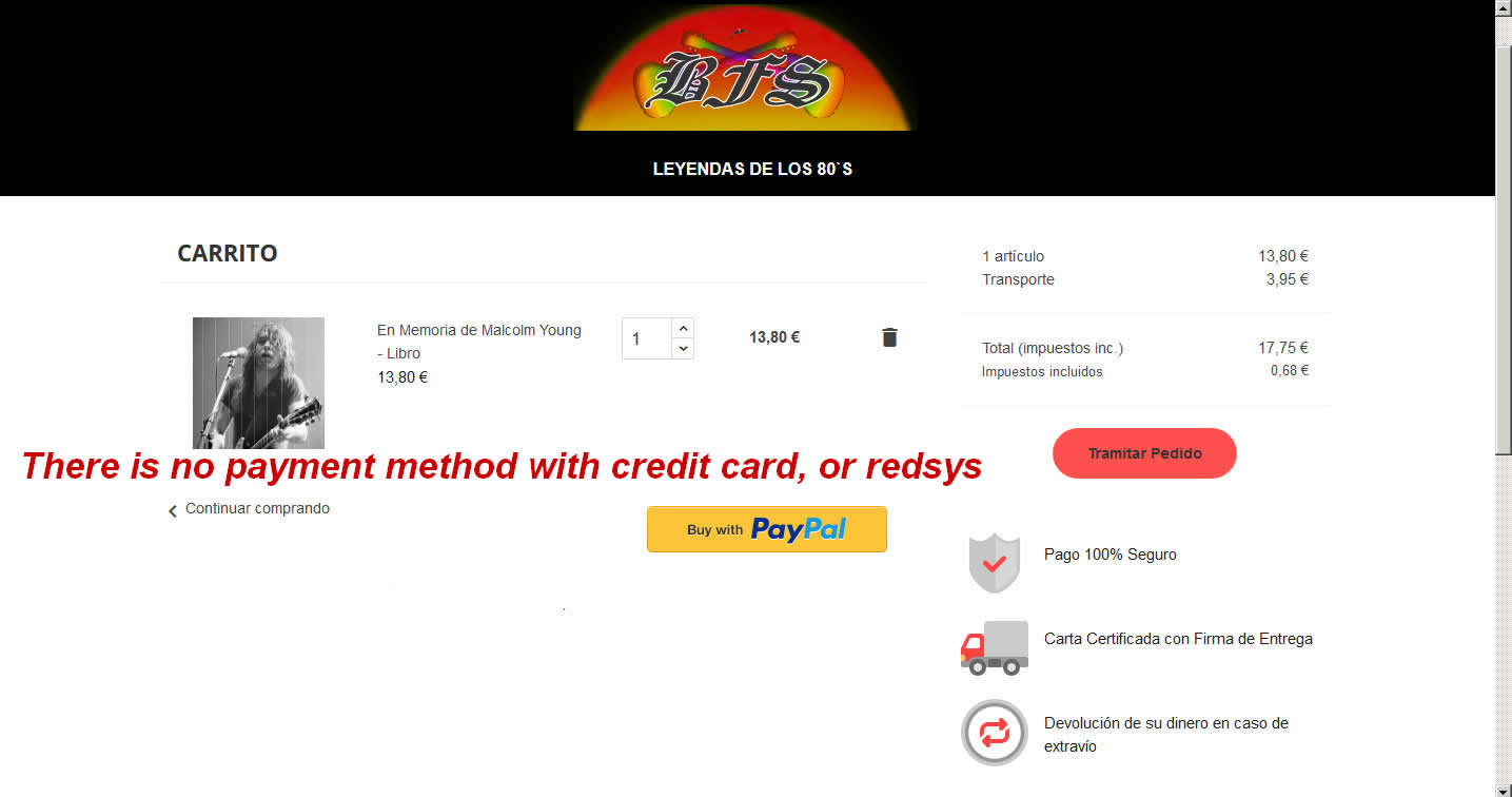 Blanca Fuertes Posted February 4, 2019 Share Posted February 4, 2019 He Comprado el módulo “Redsys”, para implementar la pasarela de pago en mi tienda online, y me he llevado una desagradable sorpresa, ya que no funciona. No lo puedo configurar, no aparecen los logotipos de redsysy, etc….. en fín nada de nada, y todo esto después de haberlo comprado y que me hubierán confirmado desde prestashop que este móduloo era compatible con mi versión de prestashop 1.7.4.2. Bueno ahora resulta que me dicen que este módulo no es compatible con mi versión de prestashop. No me lo puedo creer.!!! Por favor alguien me puede indicar si existe un módulo de Redsysy que sea compatible con mi versión 1.7.4.2. u otra manera para poder montar la pasarela de pago en mi tienda online. Muchas gracias Link to comment Share on other sites More sharing options...