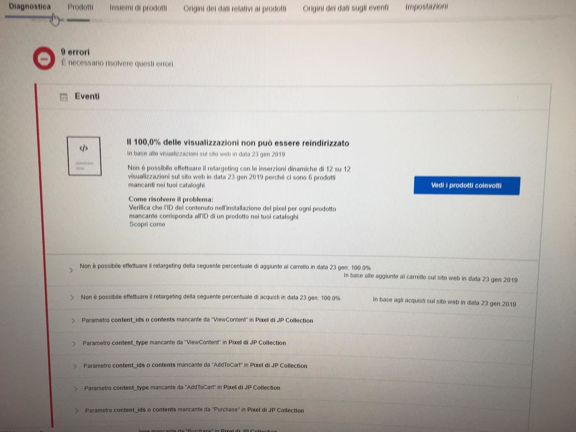 kibit Posted February 5, 2019 Share Posted February 5, 2019 Pixel configurato sullo shop versione 1..6.18 , ma nel momento in cui provo a creare un catalogo dinamico sulla campagna facebook restituisce degli errori! a qualcuno è già capitato? Il pixel viene rilevato correttamente dalla altre campagne di prodotti non dinamiche. Allego gli screen. Problema di versione prestashop? Link to comment Share on other sites More sharing options...