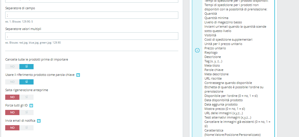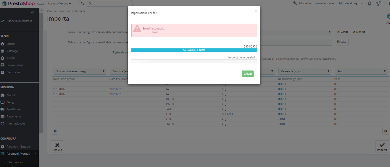 intoccabili66 Posted February 8, 2019 Share Posted February 8, 2019 Intanto ciao a tutti , vi chiedo scusa se vi disturbo ma mi serve un vostro grande aiuto perchè sono bloccato col caricamento del Csv e col problema di creare un gruppo che abbia delle aliquote ,anche se ho creato una colonna dentro il Csv con la scritta ID aliquota iva e mettendo dentro in quella colonna il valore 1 che corrisponde al valore delle tasse in Italia cioè 22%. Nonostante tutto non succede niente e mi da dei problemi anzi degli errori e non vado avanti. Sto cercando di andare avanti con questo lavoro perchè non ho altro e credetemi che un vostro aiuto mi sara d'aiuto tantissimo per poter finalmente capire dove sbagliavo , e magari non disturbarvi più e far tutto da solo. Vi allego le foto e vi scrivo qui come sto mettendo in colonna le varie voci e magari così , mi direte se sto sbagliando o meno per poter finalmente aprire il mio sito. Grazie a tutti in anticipo , non saprei mai come sdebitarmi per il vostro aiuto. Alla voce Cod metto Id- Alla voce Descrizione metto Descrizione- Alla voce foto metto Url immagine x,y,z Alla voce prezzo mio metto prezzo tasse escluse Alla voce Id aliquota metto Id aliquota iva Alla voce disponibili metto Quantità Alla voce Marca metto Marca Alla voce Descrizione gruppo metto categoria x,y,z Alla voce Peso metto Peso Alla voce end user metto prezzo tasse incluse Dopo che carico anche 50 prodotti invece di caricarli tutti mi da questo errore che vedrete nelle foto . Cosa sbaglio o cosa non ho fatto?Ho prestashop ultima versione . GRAZIE,GRAZIE,GRAZIE Link to comment Share on other sites More sharing options...