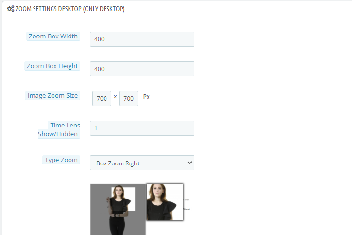 RhinoRudi Posted September 11, 2020 Share Posted September 11, 2020 16 hours ago, espanola said: Not work on mobile (or I don't know how to use): on mobile, when I touch on the screen, a box shows up and I don't know how to use zoom feature of your module. - on PC, when I set zoom size to 2000x2000, it display wrong area (the zoom image does not match with the real location of the pointer. When you go to configure the Zoom module you have to make sure it is activated for the pages you want to use it on. Look at the left column and see things like Products Categories etc. Then down at the bottom open the Mobile options and set size and type of zoom window. For the desktop make sure your zoom is relative to your image size. So if you want 1.5 zoom, then if your product image is 600x600 then set zoom to 900x900. Maybe 2000 is too large for your image size. IHTH Link to comment Share on other sites More sharing options...