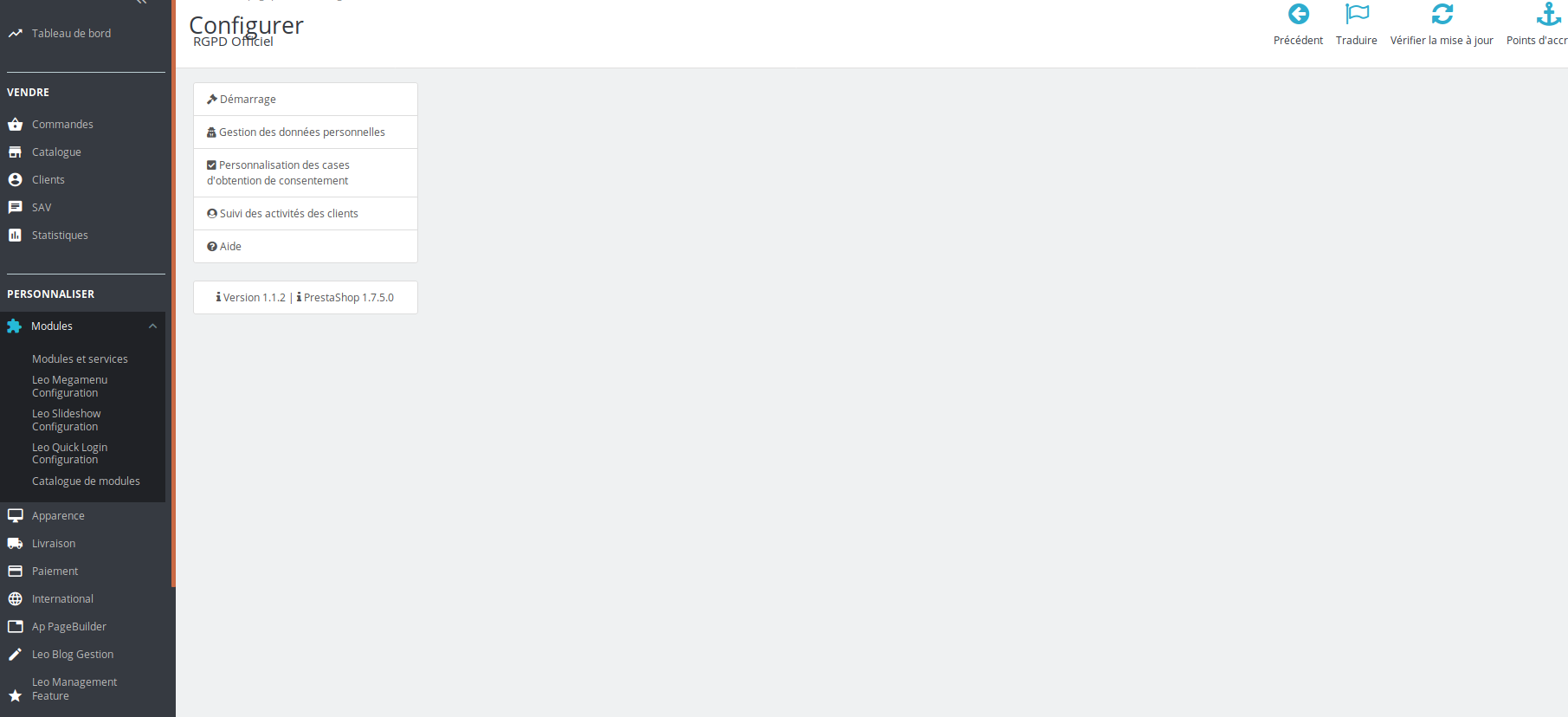 Belyce32 Posted February 13, 2019 Share Posted February 13, 2019 Type d’install (nouvelle/MàJ) :nouvelle 1.7.4 puis maj 1.7.5Version de PS : 1.7.5Hébergement : ionos mutualiséVersion de PHP : 7.2Version de MySQL :Navigateur(s) concerné(s) : firefox / chrome Bonjour, J'ai installé la version 1.7.4, configuré le module RGPD natif, tout fonctionnait jusqu'à m'apercevoir aujourd'hui qu'en ouvrant le module RGPD, il ne contient plus rien hormis les liens de menus. Les mentions déjà configurées fonctionnent toujours dans le front. Mise à jour 1.7.5 effectuée il y a 3 jours, je ne sais pas s'il y un lien... Link to comment Share on other sites More sharing options...