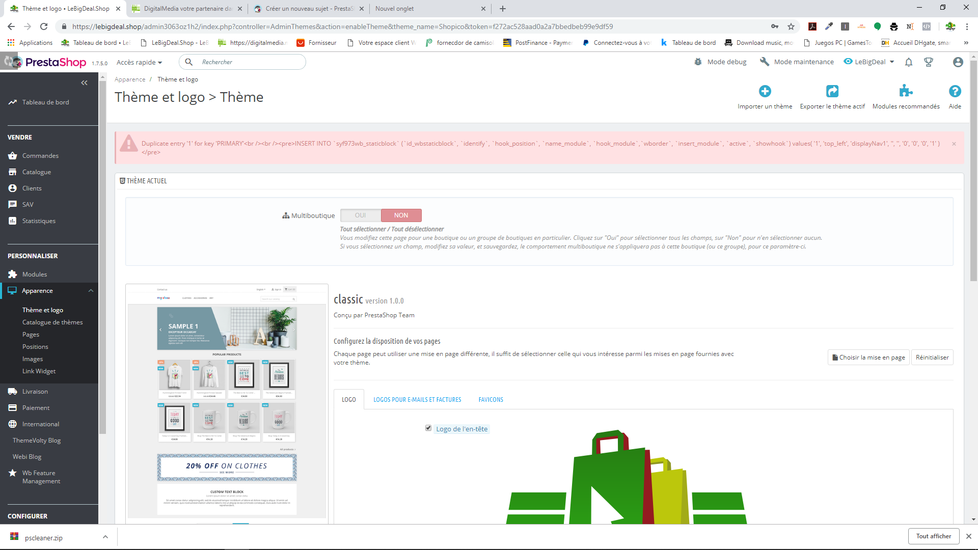 LusoServices Posted February 15, 2019 Share Posted February 15, 2019 Bonjour j'ai un probleme avec deux themes achetes et compatibles avec la 1.7.5 mais j'ai un gros probleme a quand je vais pour choisr un j'ai une erreur de php quand je vais pour choisir le deuxieme j'ai un autre message d'erreur "Duplicate" ça c'est pour le theme achete "Shopico" voir anexes. Meme le theme par defaut le classic ne s'affiche pas quelqu'un pour m'aider s'il vous plait. ScreenCapture_14_02.2019_20_10.59.xesc Link to comment Share on other sites More sharing options...