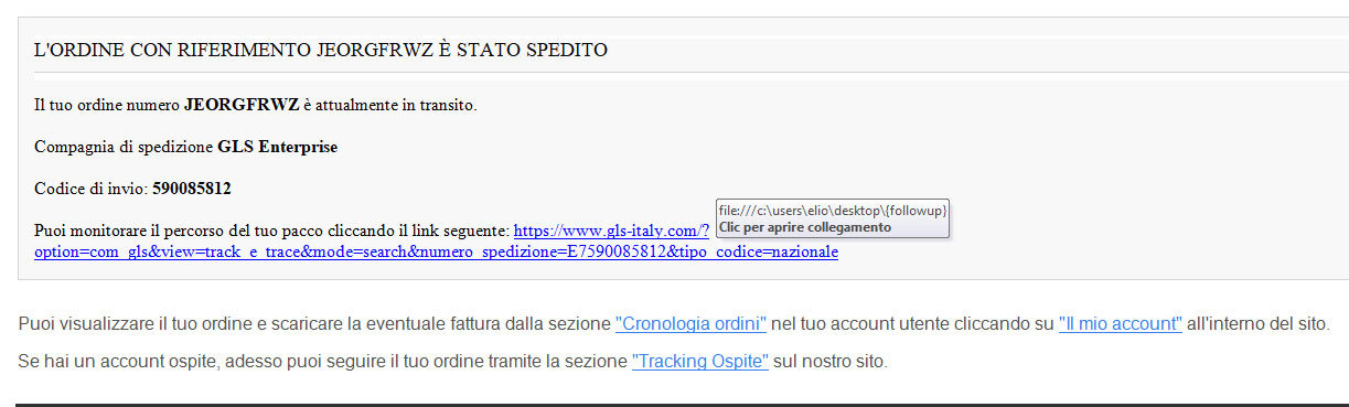il link che ho copiato dalla mail è questo: https://www.gls-italy.com/?option=com_gls&view=track_e_trace&mode=search&numero_spedizione=E7590085812&tipo_codice=nazionale è funziona, cliccando nella mail da errore dicendo di verificare il percorso o l'indirizzo internet (a vedere il collegamento non saprei da dove prende file:///c:\user\ecc. ecc.) Grazie!