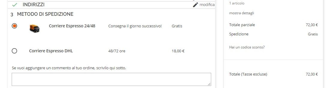 Alessia Posted February 18, 2019 Share Posted February 18, 2019 Salve a tutti ho il mio negozio collegato in sincronismo con il negozio ebay Ora in Italia abbiamo adottato spedizione gratis Mentre internazionali spedizione con dhl a pagamento. Ovviamente questo deve essere anche lato web del negozio. Invece non avviene . Mi spiego esempio un Tedesco se va su ebay paga articolo e spedizione dhl mentre se entra nel negozio a lui esce la tendina spedizione gratis e spedizione a pagamento e ovviamente mi che e' stupido lui acquista con spedizione gratis Ora come faccio ad evitare che chi compra al di fuori dall'italia esca la doppia opzione ma soltanto il pagamento dhl?? Metto qualche foto. Qui sono entrato in modalita' incognita Link to comment Share on other sites More sharing options...