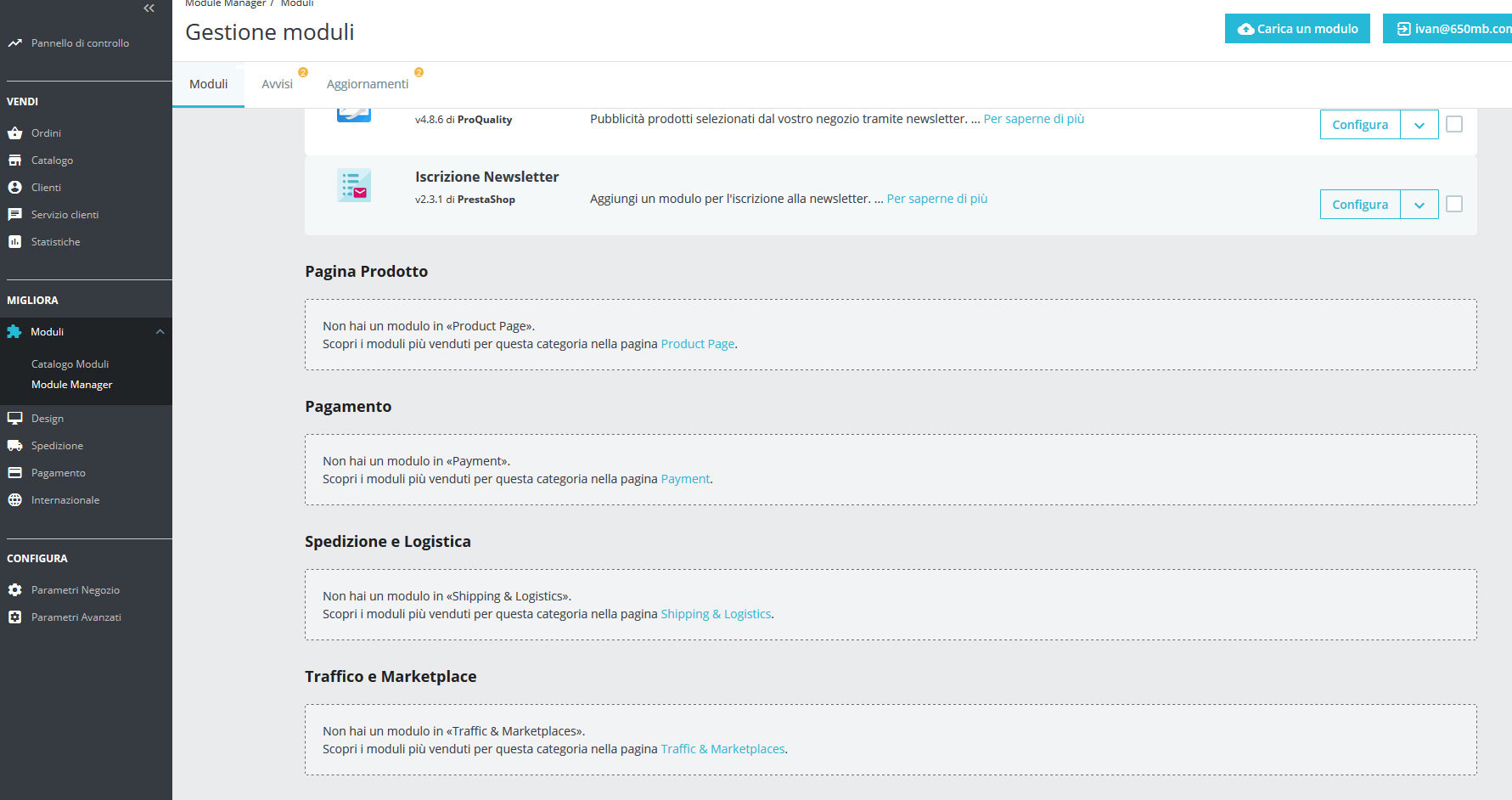 ivan650mb Posted February 18, 2019 Share Posted February 18, 2019 Buonasera, ho un prestashop 1.7.5.0, quando apro la gestione moduli nella sezione pagamento non c'è nessun modulo riconosciuto in questa categoria(vedete immagine allegata). In realtà ce ne sono tre installati (paypal, bonifico e contrassegno) e configurati (e anche funzionanti). Il problema qual'è? che ho acquistato un modulo dove ad un certo punto mi chiede di scegliere un metodo di pagamento predefinito da un menù che però risulta vuoto, credo che i due fenomeni siano legati. Avete idea di come far riconoscere da ps gli attuali moduli installati come metodi di pagamento? Grazie e saluti. Link to comment Share on other sites More sharing options...