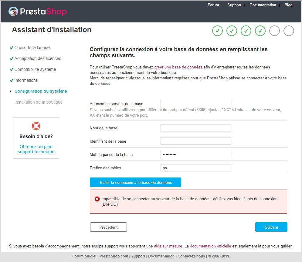 GAEC Posted February 22, 2019 Share Posted February 22, 2019 Bonjour, J'essaie d'installer prestashop 1.6.1.20 sur mon serveur. J'ai contacté 1&1 pour être sure de mes identifiants de connexion de la base, il n'y a pas d'erreur. J'ai modifié le mdp par un mdp plus simple: ça ne marche toujours pas. J'ai ce message qui s'affiche: Impossible de se connecter au serveur de la base de données. Vérifiez vos identifiants de connexion (DbPDO) Quelqu'un pourrait m'aider? svp. Link to comment Share on other sites More sharing options...