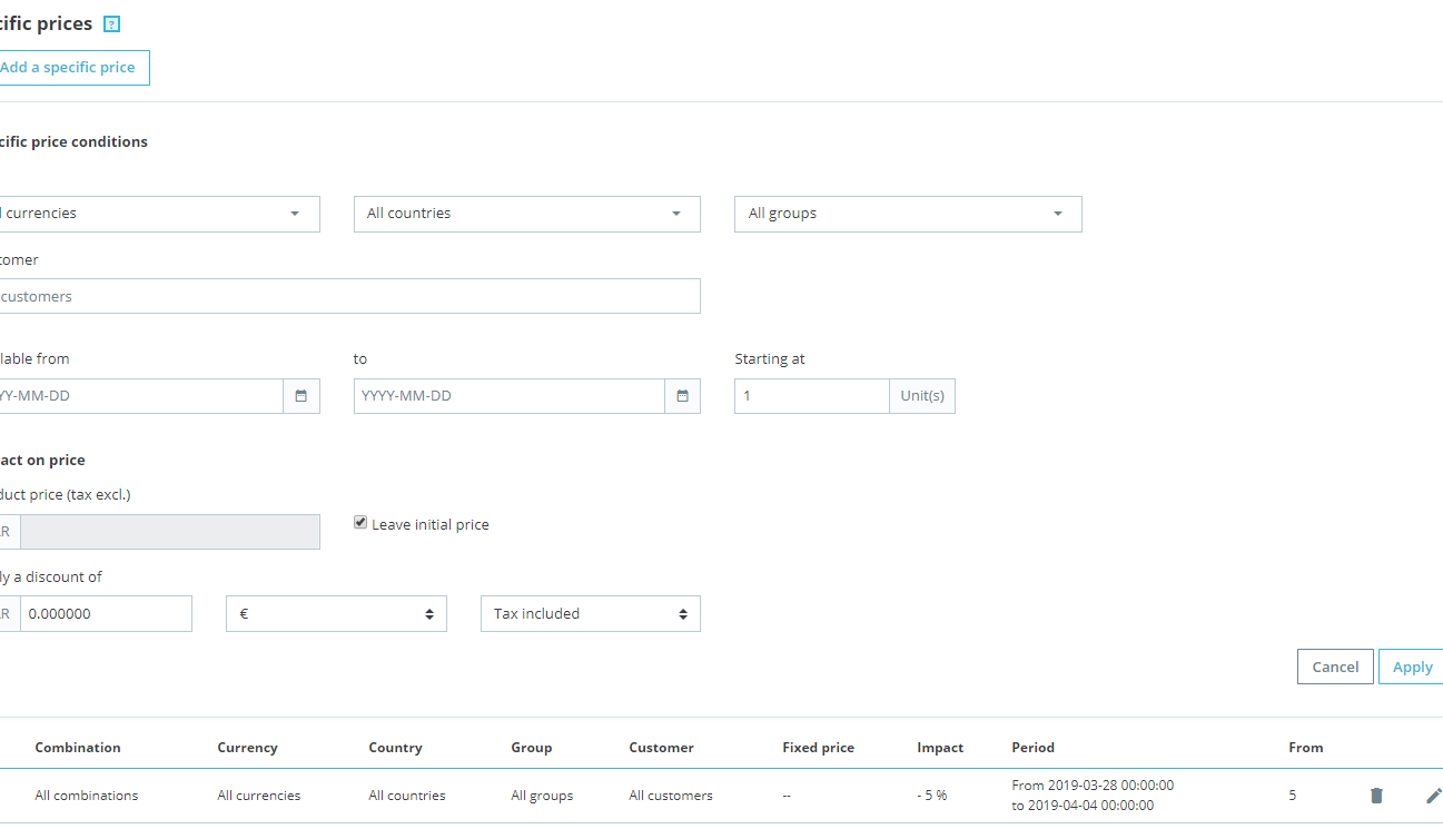 garyhoffmann Posted March 28, 2019 Share Posted March 28, 2019 I'm on 1.7.5.1 and I have the ability to set those up by product, so I apologize for misleading. Also, 1.7.5.1 seems to have a priority rule setting by item on specific prices. I'm not sure which version you are using, but it may be worth looking at 1.7.5.1 to see if it solves your needs. I'm new enough to PrestaShop and am having some troubles with specific prices also, so I may be completely off base... Link to comment Share on other sites More sharing options...
