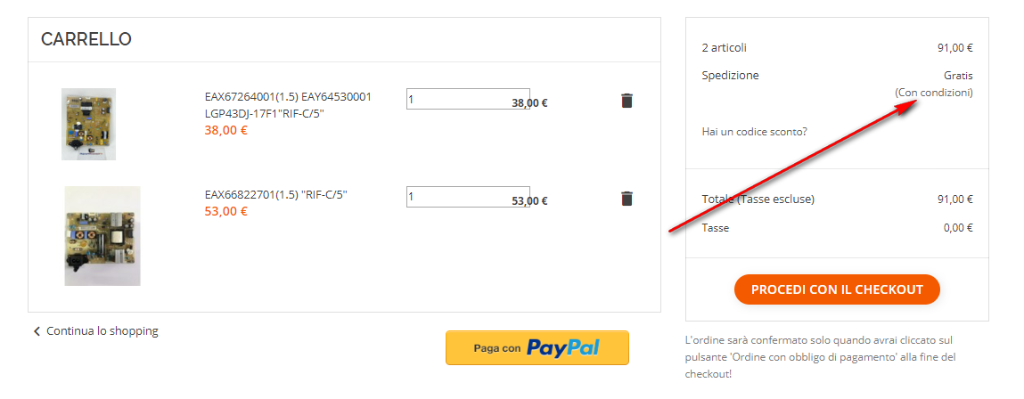 Andrea Arienti Posted February 26, 2019 Share Posted February 26, 2019 Buongiorno, ho cercato nel forum ma trovo solo risposte vecchie che non funzionano, volevo sapere come fare per sostituire la scritta gratis con condizioni che appare quando si mette un prodotto nel carrello con il da calcolare Grazie Link to comment Share on other sites More sharing options...