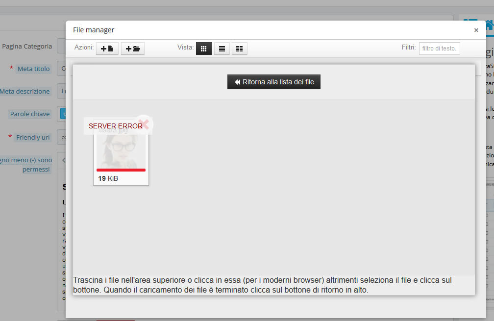 scarletl Posted February 26, 2019 Share Posted February 26, 2019 Salve dopo la migrazione di prestashop 1.7.4.4 da un server ad un altro non riesco piu' a caricare le immagini nel cms attraverso il file manager di prestashop Ogni volta che tento l'upload mi vien vuori ERRORE del SERVER (vedi immagine allegata) e il caricamento non va a buon fine. Il file manager mi permette di inserire nuove cartelle, rinominare i file e cancellarli, ma non mi permette l'upload Ho provato a cambiare via FTP i permessi nelle cartelle delle immagini ma il problema sussiste. Nessun problema col caricamento delle immagini del prodotto. L'errore sembra interessare solo l'upload delle immagini nella cartella e sottocartelle di cms Qualcuno sa darmi qualche suggerimento? Link to comment Share on other sites More sharing options...
