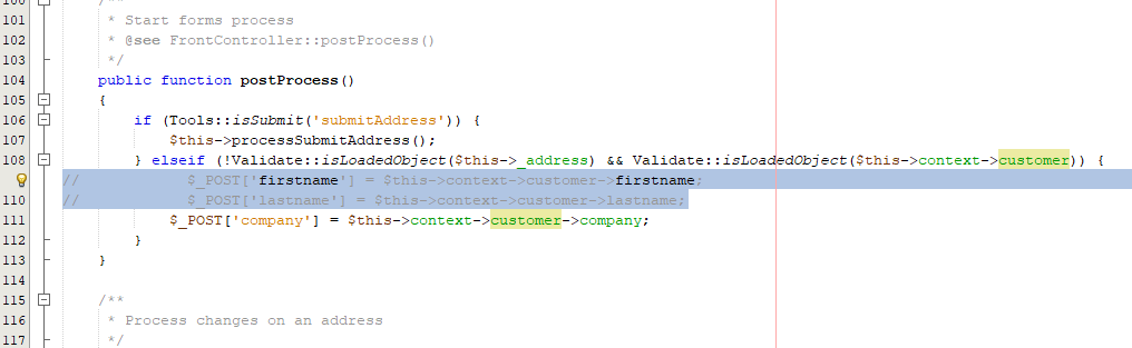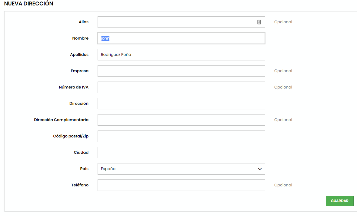 john rodriguez Posted March 9, 2019 Share Posted March 9, 2019 (edited) Hay una funcionalidad en Prestashop que al crear una dirección nueva asociada a un usuario, se abre el formulario nueva dirección y automaticamentes se copia en nombre y el apellido del usuario en el formulario, en su momento desactive esta funcionalidad en la versión 1.6, modificando el archivo AddressController.php, en la línea 109 comentando el siguiente código. Quiero hacer lo mismo en la versión de Prestashop 1.7, pero logicamente a cambiado el archivo AddressController.php y no soy capaz de encontrar donde se gestiona este automatismo en la nueva versión. Quiero solicitar ayuda a los integrantes de este foro, Gracias. Adjunto imagen del formulario donde se inserta el nombre y el apellido automáticamente. Edited March 14, 2019 by john rodriguez (see edit history) Link to comment Share on other sites More sharing options...