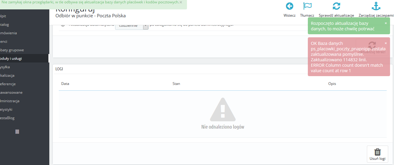 Przy aktualizacji punktów odbioru wyskakuje błąd: ERROR Column count doesn't match value count at row 1.