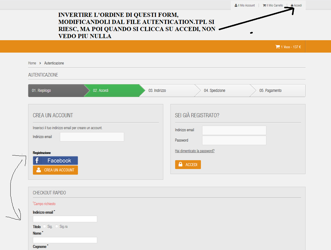 Prestashop New User Posted March 14, 2019 Share Posted March 14, 2019 Ciao a tutti, sono nuovo nel mondo di prestashop. Ho un negozio e-commerce, e gli utenti dopo che fanno l'acquisto inviano l'ordine tramite un form di checkput rapido. Vi sono comunque nella stessa pagina di autenticazione anche altri due form, uno "CREA UN ACCOUNT" e uno "SEI GIA REGISTRATO". Io invece vorrei che nella fase di autenticazione questi due form non mi spuntino, ma solo io form di chack out rapido. Sono riuscito a fare ciò, modificando il file autenthication.tpl, spostando l'ordine, ma poi se vai tramite il pulsante sull'header ACCEDi non vedo piu quei due form di prima, che incece lì mi servono. Allego delle immagini per capire meglio. Grazie a tutti Link to comment Share on other sites More sharing options...