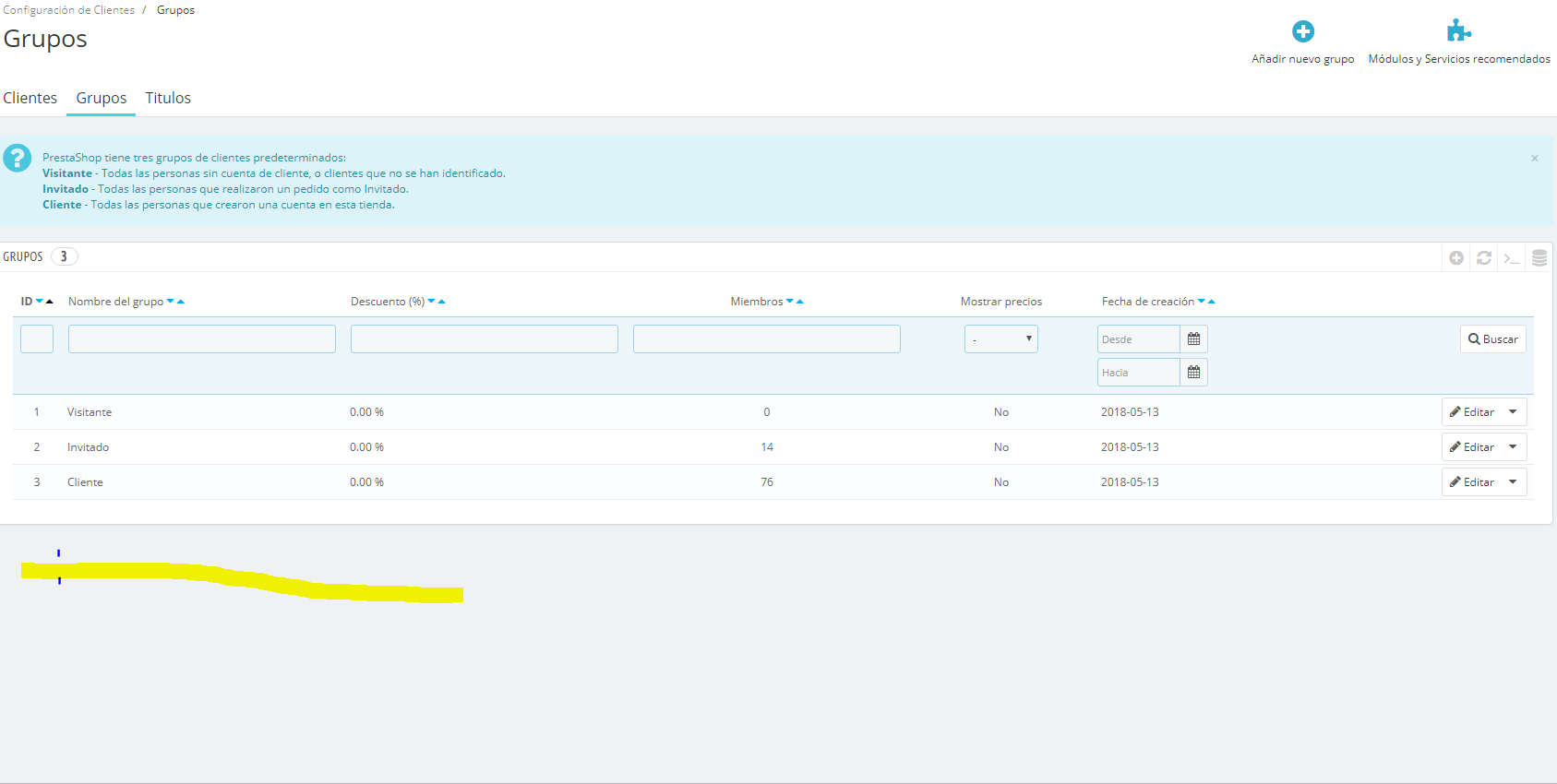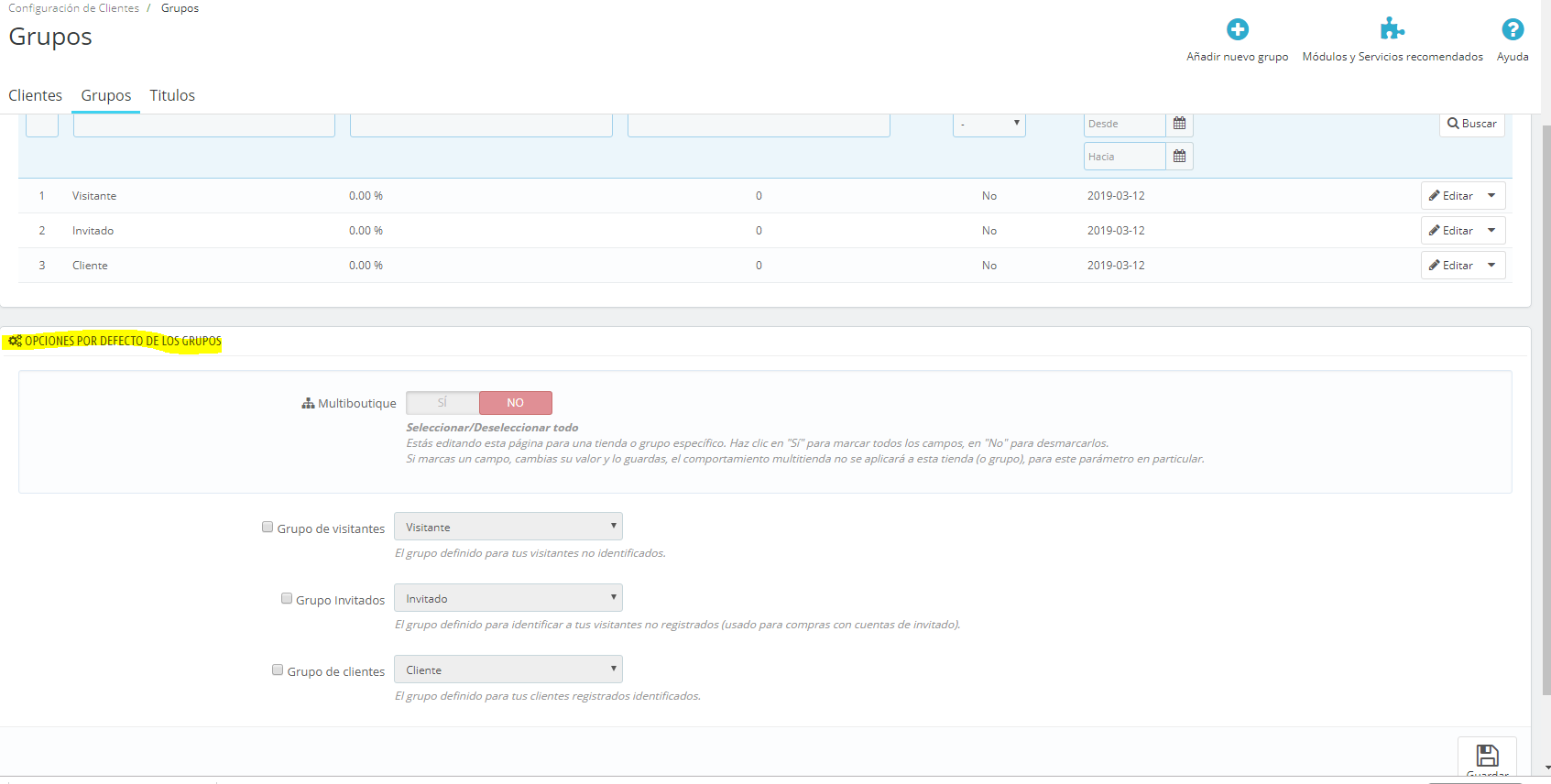 Buenas tardes, tengo un problema con mi tienda Prestashop. En la parte de configuración de la tienda ---configuración de clientes   OPCION     grupos