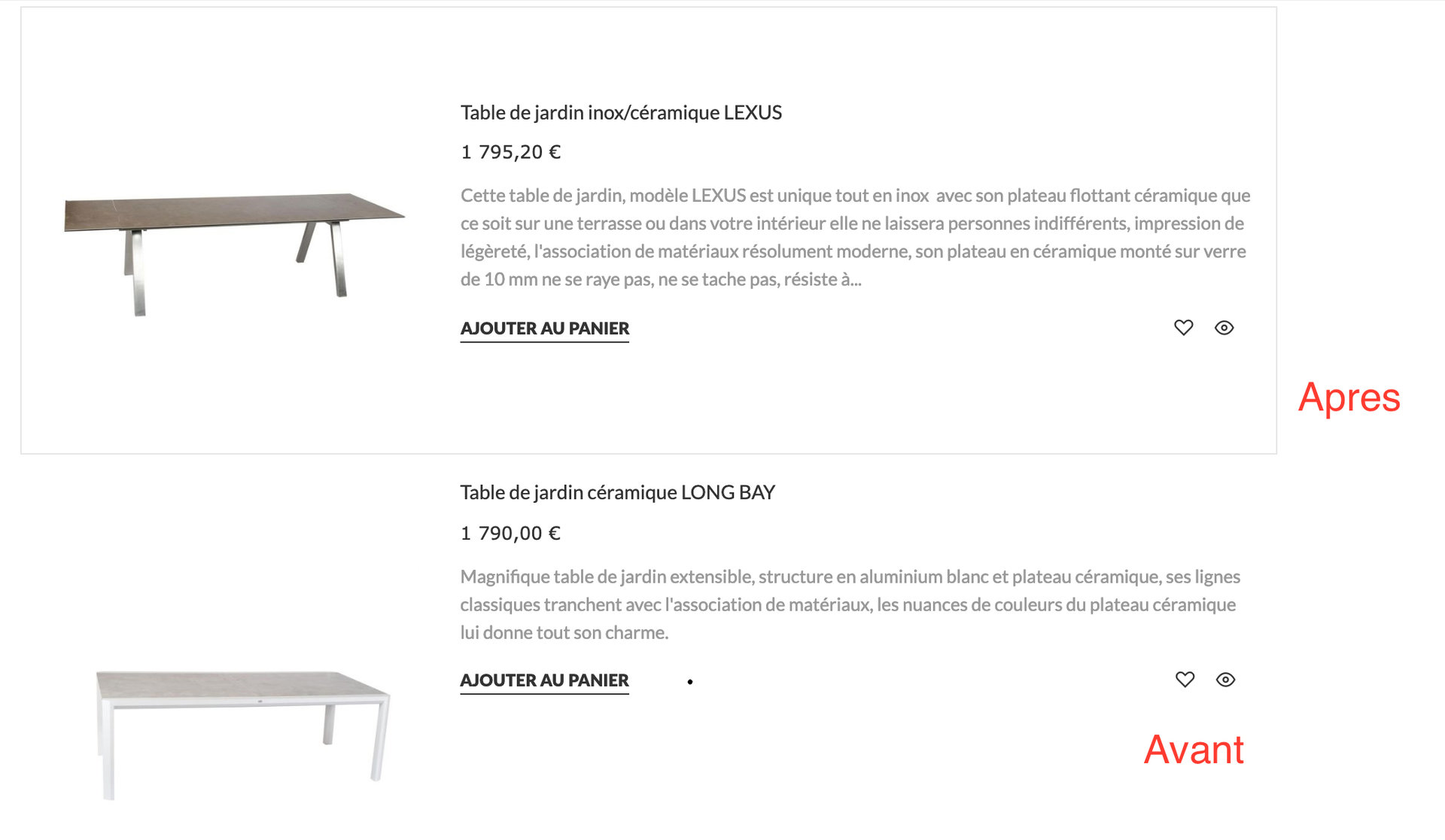 Imaginis Posted March 16, 2019 Share Posted March 16, 2019 Bonjour, J'utilise Prestashop 1.6.1.23 Dans les pages des catégories, je souhaite qu'en mode "Liste", les informations à droite de la photo soient centrées verticalement et non alignées sur le haut de la div comme c'est le cas par défaut (voir image ci-joint). J'ai fait quelques tentatives avec un "vertical-align" ou un "padding-top" dans le CSS product_list.css mais sans succès (et dans ce dernier cas ma modification s'est répercutée en affichage mosaïque, ce que je ne veux pas). J'imagine que ce ne doit pas être grand chose à modifier au niveau du CSS, mais j'avoue tourner en rond, je débute en code... Si quelqu'un pouvait m'éclairer... Merci par avance ! Damien Link to comment Share on other sites More sharing options...