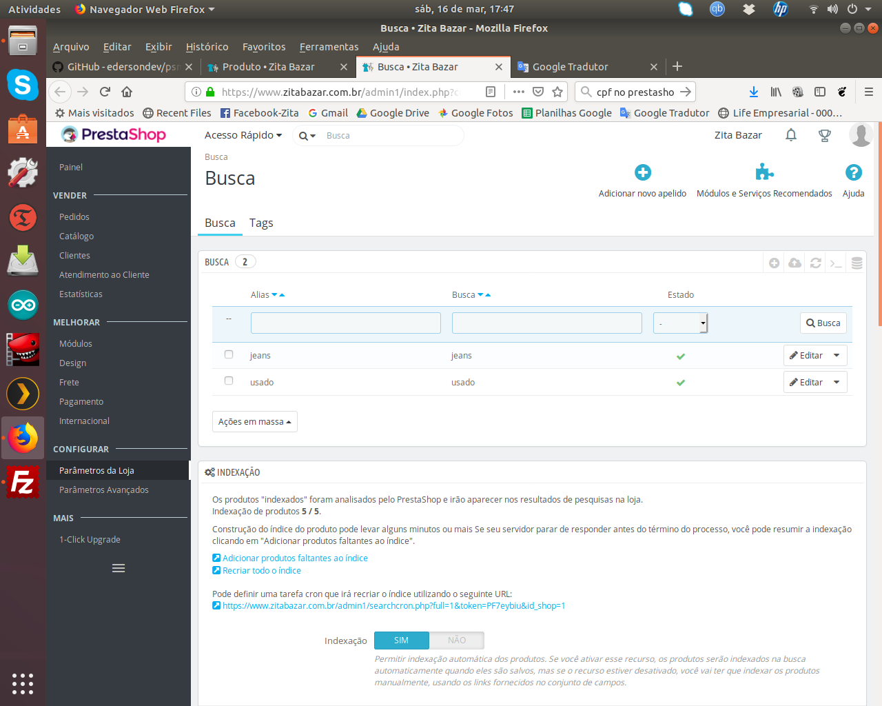 Simoes Posted April 27, 2019 Author Share Posted April 27, 2019 (edited) Me desculpe, mas alterei de pois que postei, Max_execution e provável max_input_time para 300, upload_max_filesize e post_max_size para 32, não tinha a poção de por 20 como sugerido. Não acusa ero com o debug mode ligado nem log de erro. U&nica coisa que indica estar errado é link que essa área aponta: https://www.zitabazar.com.br/admin1/index.php?controller=AdminSearchConf&token=020e20a914ac8a1b3f4a00a9a82c6d71 Edited April 27, 2019 by Simoes (see edit history) Link to comment Share on other sites More sharing options...