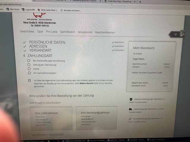 Wolle-Seide-Meer Posted March 19, 2019 Share Posted March 19, 2019 Hallo, ich nutze Prestashop in der Version 1.7.5.1 und das Modul Geschenkkarten in der Version 1.5.4 Die Gutscheine lassen sich anlegen und werden auch angezeigt (Fotos liegen bei.) Wenn der Kunde einkauft, kann der Gutschein nicht eingelöst werden, da die Möglichkeit nicht beim Checkout angeboten wird. Wo im Shop läss es sich einstellen, dass das Feld "Gutschein Einlösen" angezeigt wird? Ich bitte um Unterstützung Vielen Dank im Voraus Eva Santau Link to comment Share on other sites More sharing options...