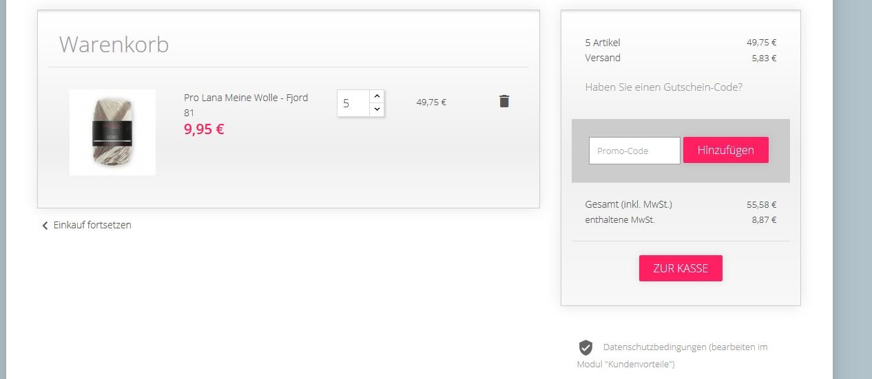 Wolle-Seide-Meer Posted March 19, 2019 Author Share Posted March 19, 2019 Hallo, der Warenwert im Warenkorb ist 35 Euro zzgl. MWSt und Versand Es wird trotzdem das Feld mit dem Rabatt/Gutschein nicht angezeigt. (Siehe Foto) die Adresse vom Shop ist: https://shop.wolle-seide-meer.de Link to comment Share on other sites More sharing options...