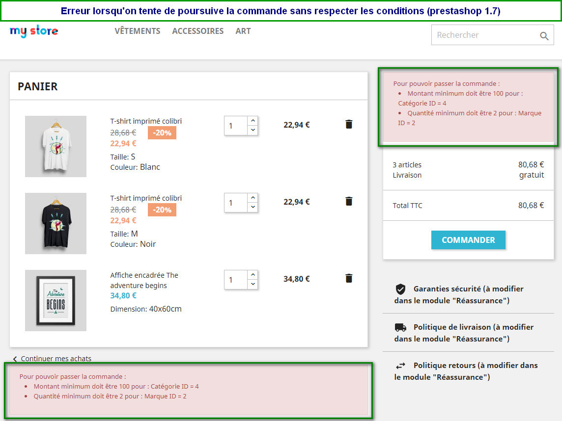Fernand WAFO Posted March 20, 2019 Share Posted March 20, 2019 (edited) Avec ce module, Vous pouvez limiter les commandes selon les quantités ou montant minimum et maximum et par catégorie, marque ou fournisseur. Prendre le module ici Caractéristique : Vous avez des produits à vendre selon des quantités minimum ou maximum des catégories, des marques ou des fournisseurs? Vous souhaitez vendre uniquement sous au-moins un montant minimum ou maximum des catégories, des marques ou des fournisseurs?. Ce module vous permet de définir des règles multiple de limitation d'une commande votre boutique. Ainsi, vous pouvez par exemple définir : Fixer une quantité minimum et une quantité maximum pour une catégorie X (et vous pouvez le faire pour plusieurs catégories différemment) Fixer un montant minimum et un montant maximum pour une catégorie X (et vous pouvez le faire pour plusieurs catégories différemment) Fixer une quantité minimum et une quantité maximum pour une marque X (et vous pouvez le faire pour plusieurs marques différemment) Fixer un montant minimum et un montant maximum pour une marque X (et vous pouvez le faire pour plusieurs marques différemment) Fixer une quantité minimum et une quantité maximum pour un fournisseur X (et vous pouvez le faire pour plusieurs marques différemment) Fixer un montant minimum et un montant maximum pour une marque X (et vous pouvez le faire pour plusieurs fournisseurs différemment) Fixer une quantité minimum et une quantité maximum pour une liste de produits sélectionnés (et vous pouvez le faire pour plusieurs listes différemment) Fixer un montant minimum et un montant maximum pour une liste de produits sélectionnés (et vous pouvez le faire pour plusieurs listes différemment) Et pour chaque cas, vous pouvez choisir juste certains clients sur lesquelles la condition peut s'appliquer. Pour un panier, vous pouvez définir autant de conditions que vous voulez. Un exemple concret pour une boutique qui vend des stylos de 2 fournisseurs A et B, des chemises de marques Adidas et Puma, des pantalons de la marque adidas, des tasses et plusieurs autres produits. Le marchand peut par exemple définir ceci (ensemble) : Les stylos du fournisseur A se commandent uniquement pour aumoins 100 pièces Les stylos du fournisseur B se commandent au trop pour 1000 pièces Les produits de la catégorie "Tasses" se vendent pour des montants compris entre 100€ et 500€ La marque Adidas se commandent pour au moins 100€ (donc un client peut prendre des chemises pour 60€ et des pantalons pour 40€ mais de la même marque adidas) La marque puma se vend en quantité minimum de 30 pièces. Prendre le module ici Edited March 20, 2019 by cleandev Ajout tag (see edit history) Link to comment Share on other sites More sharing options...