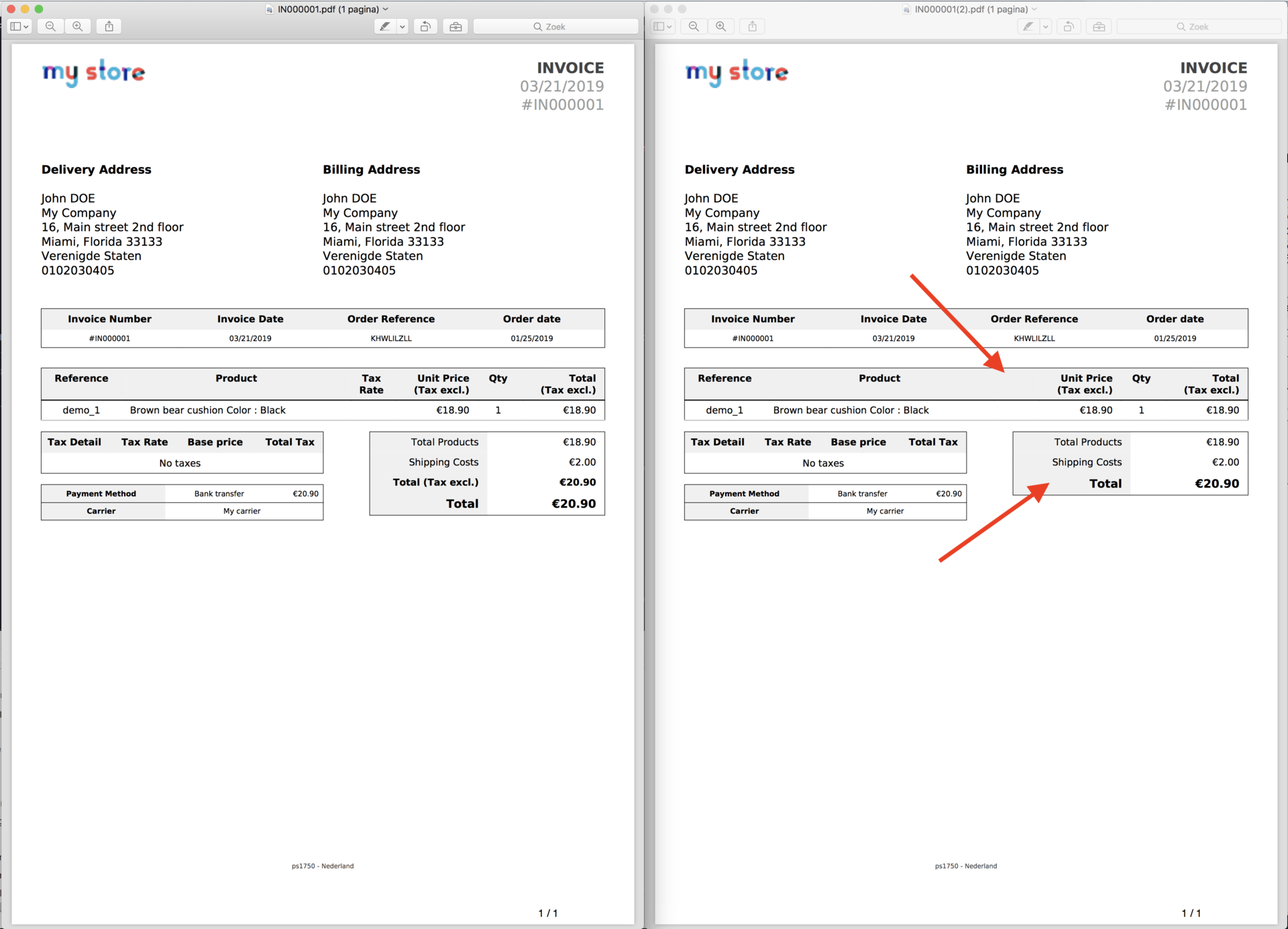 MARK-APP.com Posted March 21, 2019 Share Posted March 21, 2019 Beste Cybertopia, Kan het zijn dat je naar het verkeerde bestand kijkt als gedownload pdf bestand (het oude bestand)? Ik heb het zojuist nog getest en dat lijkt gewoon goed te werken. Verder moet je voor de andere tekst zijn in pdf/invoice.total-tab.tpl Dan zoeken naar: <tr class="bold"> <td class="grey"> {l s='Total (Tax excl.)' d='Shop.Pdf' pdf='true'} </td> <td class="white"> {displayPrice currency=$order->id_currency price=$footer.total_paid_tax_excl} </td> </tr> {if $footer.total_taxes > 0} <tr class="bold"> <td class="grey"> {l s='Total Tax' d='Shop.Pdf' pdf='true'} </td> <td class="white"> {displayPrice currency=$order->id_currency price=$footer.total_taxes} </td> </tr> {/if} en veranderen naar: {*<tr class="bold"> <td class="grey"> {l s='Total (Tax excl.)' d='Shop.Pdf' pdf='true'} </td> <td class="white"> {displayPrice currency=$order->id_currency price=$footer.total_paid_tax_excl} </td> </tr> {if $footer.total_taxes > 0} <tr class="bold"> <td class="grey"> {l s='Total Tax' d='Shop.Pdf' pdf='true'} </td> <td class="white"> {displayPrice currency=$order->id_currency price=$footer.total_taxes} </td> </tr> {/if*} Zie mijn screenshot als voorbeeld. Link to comment Share on other sites More sharing options...
