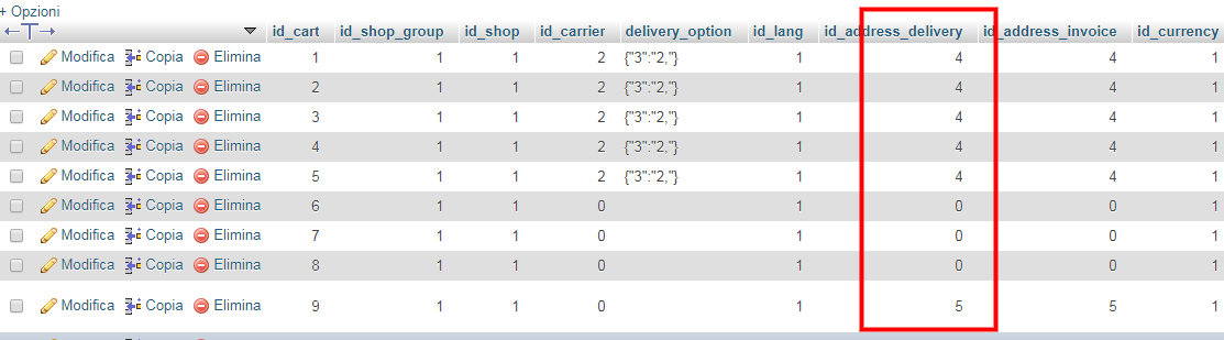 Idroclic Posted March 21, 2019 Share Posted March 21, 2019 (edited) Ciao, prova ad eliminare i clienti di prova che prestashop inserisce di default con le nuove installazioni.. Se così non risolvi prova ad andare nel tuo DB nella tabella ps_cart table! Da qui dovresti eliminare tutto quello che vedi con id_address_delivery: 194. Fai prima un backup del DB! Edited March 21, 2019 by Idroclic (see edit history) Link to comment Share on other sites More sharing options...