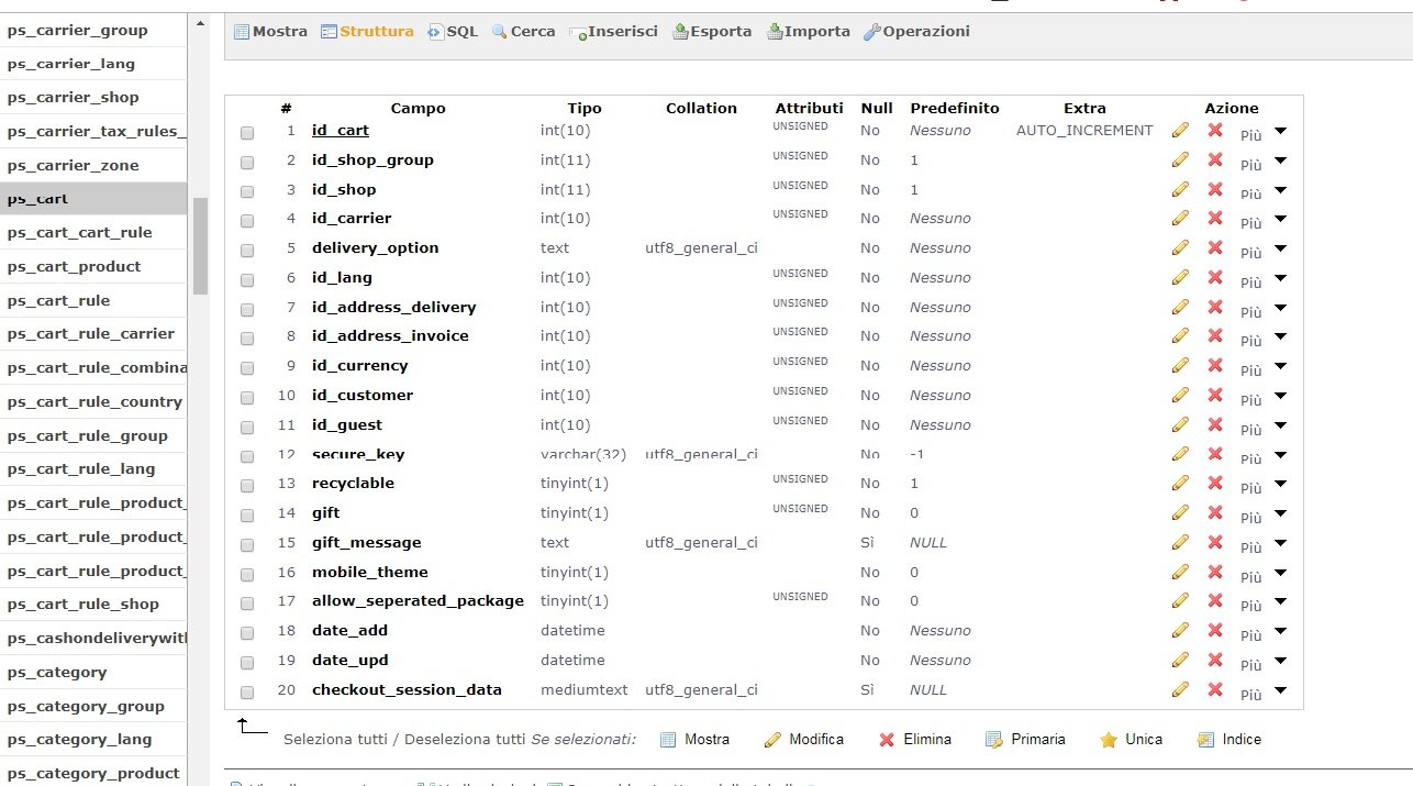 Idroclic Posted March 22, 2019 Share Posted March 22, 2019 16 hours ago, Crazy Cat Hobby said: problema... non ho una cartella ps_cart table! Scusami ma per errore ho riportato anche il testo "table"! In ogni caso la tabella ti mostrerà risultati simili a questi (ps 1.7): 1 Link to comment Share on other sites More sharing options...
