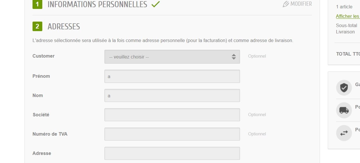 Yannick3476 Posted March 26, 2019 Share Posted March 26, 2019 (edited) Bonjour, Je suis sur Prestashop 1.7.5.1. En Front office, quand les clients ont validé leur panier et leurs informations personnelles, dans le bloc adresse, il y a un champ "customer" optionnel avec un menu déroulant "--Veuillez choisir---" qui a priori ne sert à rien que je n'arrive pas à enlever. Quelqu'un peut-il m'aider ? Merci Edited March 27, 2019 by Yannick3476 (see edit history) Link to comment Share on other sites More sharing options...