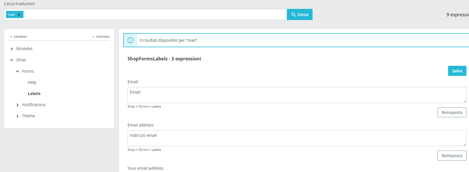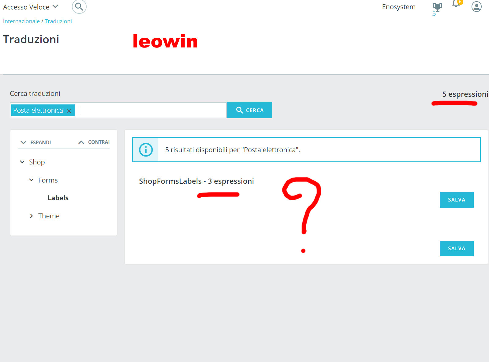 Ciao Roby, ho anche io un tema Leo, e ho il tuo identico problema con le traduzioni (a parte questo noto che in generale le traduzioni prestashop sono buggate, quelle di alcuni moduli non si salvano nemmeno). Comunque puoi modificare manualmente via file. Sarebbe questo, a partire dalla cartella del tema: /translations/it-IT/ShopFormsLabels.it-IT.xlf