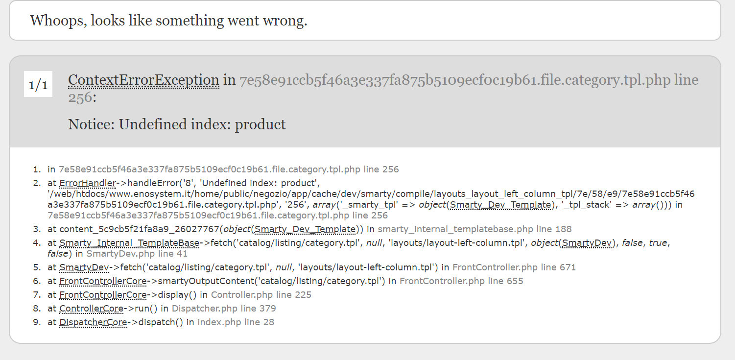 no non le vedo quelle voci, comunque ho inviato il problema al team di leowin che ci hanno messo mani e praticamente la questione ora è come segue;  se inserisco la modalita debug le modifiche testuali che hanno fatto si vedono ma non mi si vedono più tutte le categorie e sotto categorie.. (la home e i prodotti si), il messaggio d'errore che appare lo allego, se tolgo la modalita debug tornano visibile le categorie ma il testo delle traduzioni ritorna come prima ...  il sito è questo www.enosystem.it prova ad andare su una categoria o sottocategoria del megamenu ora è inserita la modalità debug