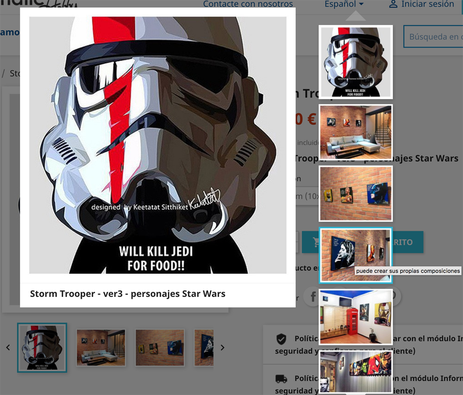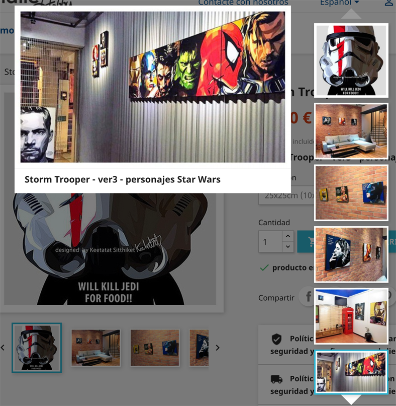pacoroige Posted April 4, 2019 Author Share Posted April 4, 2019 Hola y gracias Cada imagen ya tiene su leyenda, que es el "globo" de texto que aparece cuando pones el cursor encima de cada imagen Lo que necesito es que al pié de cada imagen ampliada del producto aparezca la leyenda configurada para esa imagen concreta, ya que ahora aparece para todas las imágenes el "product-description-short" definida para ese producto. Esto no sería problema si las diferentes imágenes fueran vistas del mismo producto pero, en mi caso, el resto de imágenes suelen ser de aplicaciones o usos de este producto, y me gustaría que apareciese el comentario correspondiente a cada imagen presentada. Link to comment Share on other sites More sharing options...