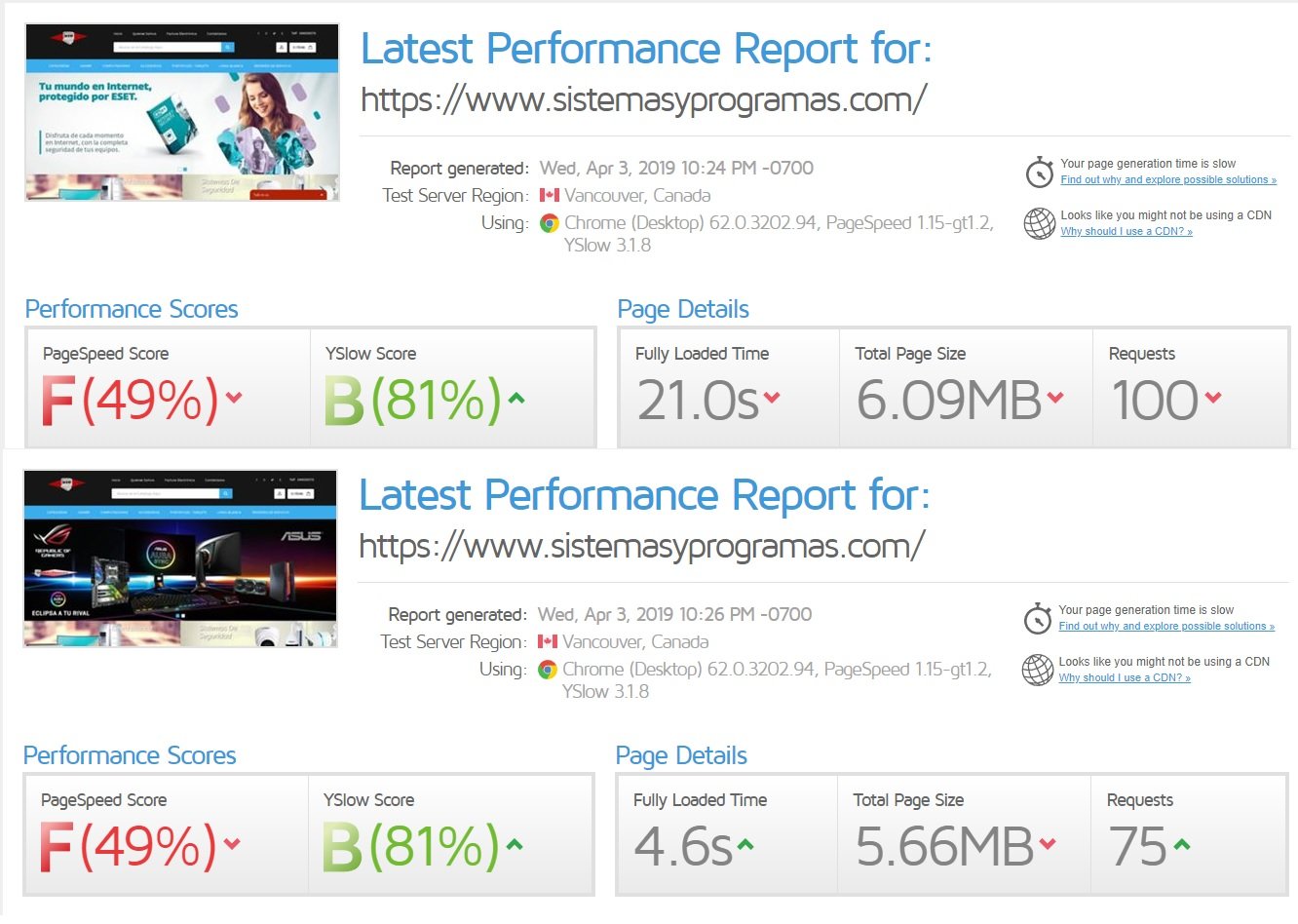 RicRey Posted April 4, 2019 Author Share Posted April 4, 2019 4 hours ago, Rodrigo B Laurindo said: Intenta eso: <script> window.onload = function(){ setTimeout(retrasaAparicion, 10000) }; function retrasaAparicion() { var js = document.createElement('script'); js.src = 'chat.sistemasyprogramas.com/php/app.php?widget-init.js'; document.head.appendChild(js); } </script> No he testado, si no funciona mira por si hay algún error em el js console gracias me ayudo mucho pero lo configuré en 3000 y tambien como es un subdominio me salia error, así que le añadí // 2 hours ago, burrots said: Solo una cosa, retrasando la aparacion del script no mejoraras para nada la velcodiad incial de la pagina. tu archivo css por ejemplo tarda 4 veces mas a cargar q el js externo. Solo la peticion inicial con tu server ya son mas de 2 segundos. Lo q podrias hacer para mejorar algo es poner javscript en el footer desde rendimiento, pr poco puedes hacer aparte de intentar contratar mejor server. Saludos Te comento que mi servidor está alojado en Ecuador no se de donde seas tú, acá en Ecuador me carga bastante bien... pero quiero mejorarla aún más optimizarla bien, quiero que por lo menos todo llegue a "B", aunque es bien complicado... mira esta imagen de los tiempos de respuesta y request de gtmetrix, cambian mucho por el "chat" Link to comment Share on other sites More sharing options...