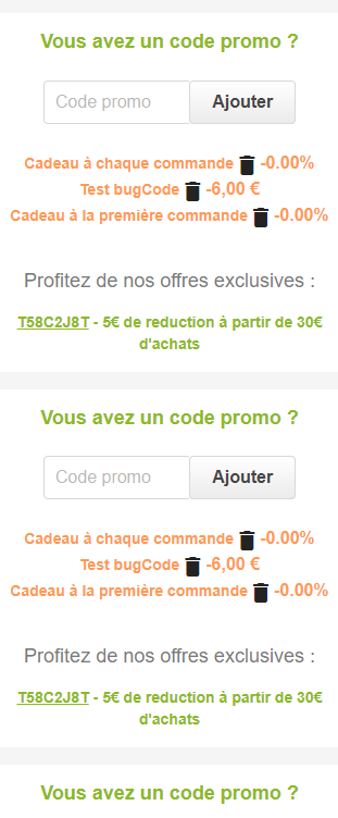 Sekka Posted April 8, 2019 Share Posted April 8, 2019 (edited) Bonjour à tous, Je viens ici à la recherche d'une petite aide car en voulant customiser ma page panier, il semblerait que j'ai cassé une boucle quelque part dans le cart-voucher.tpl. Maintenant quand je rentre un code promo, le code est certes validé mais un nouvel encart apparaît et ces doublons apparaissent à l'infini quand j'effectue une action sur la page du panier. Je joins une petite image pour que ce soit plus clair. Est-ce que quelqu'un saurait me dire quelle boucle se répète mal ? J'ai essayé d'annuler tous mes changements, même avec le fichier du thème parent je retrouve le même bug... J'avoue être un peu perdu du coup. Merci d'avance. Edited April 11, 2019 by Sekka (see edit history) Link to comment Share on other sites More sharing options...