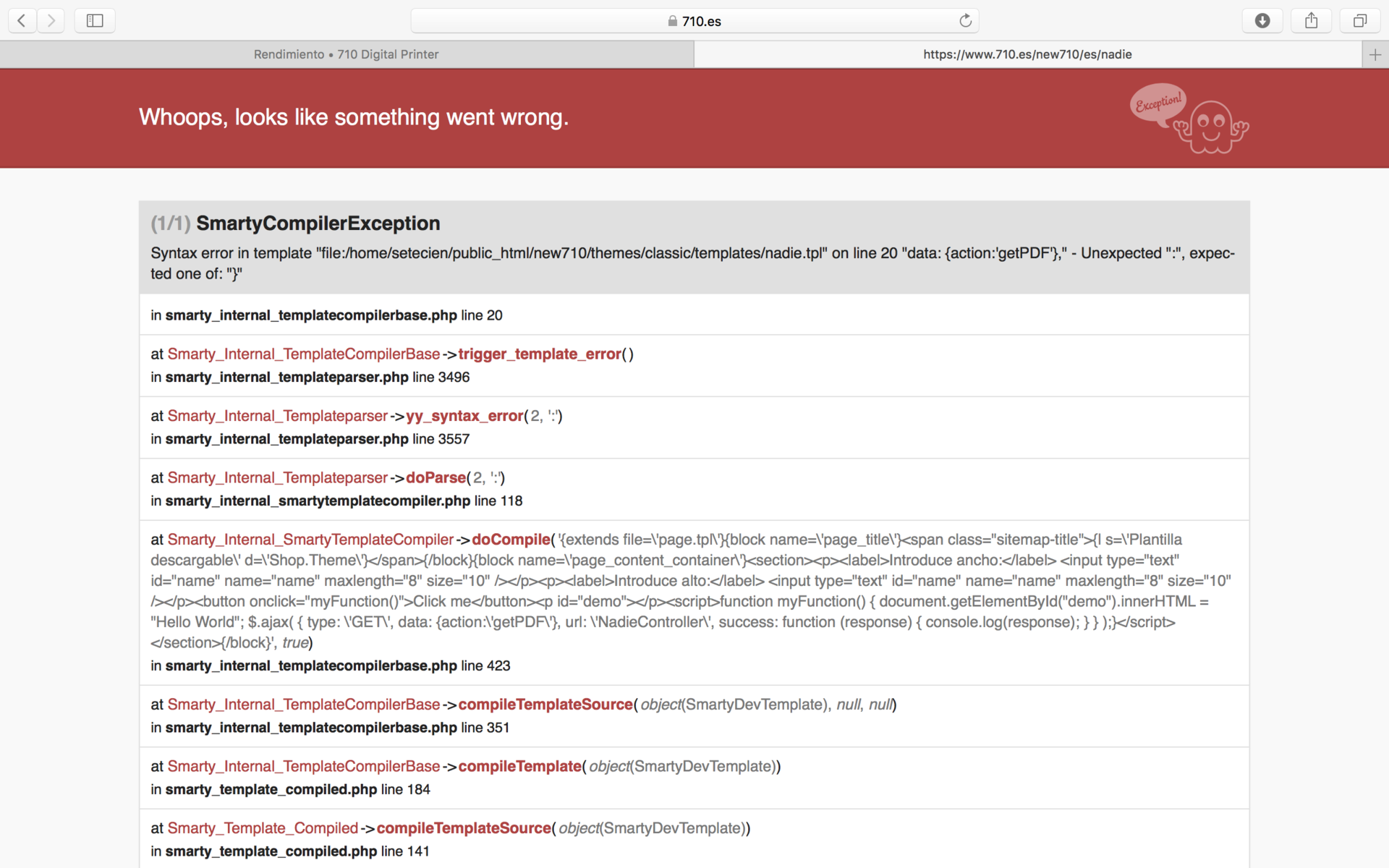 Angel Moral Posted April 9, 2019 Share Posted April 9, 2019 Hola, he creado una web con php siguiendo el tutoría del Victor Ródenas (https://victor-rodenas.com/2017/04/23/crear-pagina-php-en-prestashop-1-7/) y he adaptado el código a lo que yo quiero que realice ese página. Esa página quiero que tenga dos campos de texto donde el usuario introduce el alto y el ancho y un botón que al pulsarlo llame a una función del archivo php que generará un pdf con las dimensiones marcadas por el usuario. Para realizar esto lo he hecho de la siguiente manera: En el archivo nadie.tpl (themes/classic/templates/nadie.tpl) {extends file='page.tpl'} {block name='page_title'} <span class="sitemap-title">{l s='Plantilla descargable' d='Shop.Theme'}</span> {/block} {block name='page_content_container'} <section> <p><label>Introduce ancho:</label> <input type="text" id="name" name="name" maxlength="8" size="10" /></p> <p><label>Introduce alto:</label> <input type="text" id="name" name="name" maxlength="8" size="10" /></p> <button onclick="myFunction()">Click me</button> <p id="demo"></p> <script> function myFunction() { document.getElementById("demo").innerHTML = "Hello World"; $.ajax( { type: 'GET', data: {action:'getPDF'}, url: 'NadieController', success: function (response) { console.log(response); } } ); } </script> </section> {/block} y en el fichero NadieController.php (controller/front/NadieController.php) <?php class NadieControllerCore extends FrontController { public $php_self = 'nadie'; public function initContent() { parent::initContent(); if(isset($_GET['action']) && !empty($_GET['action'])) { $action = $_GET['action']; switch($action) { case 'getPDF' : getPDF();break; // ...etc... } } $this->setTemplate('nadie'); } public static function getPDF(){ ob_start(); require('vendor/fpdf/fpdf.php'); $pdf = new FPDF('P','mm',array(20,10)); $pdf->AddPage(); $pdf->Output(); } } He mirado en internet y l sintaxis creo que es correcta, sin embargo, me muestra el error que adjunto en la imagen. Link to comment Share on other sites More sharing options...