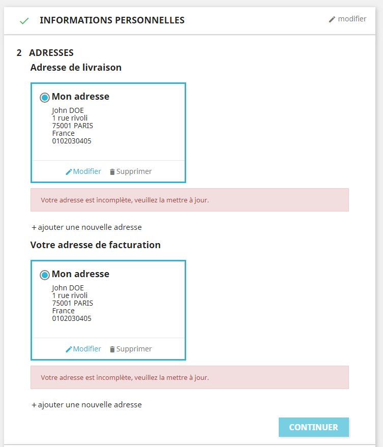 Imago-media Posted April 19, 2019 Share Posted April 19, 2019 (edited) Bonjour, PS 1.7.5.1 Sur le thème de base, lors du processus de commande, il m'est impossible d'aller plus loin que l'étape de configuration des adresses car un message d'erreur "Votre adresse est incomplète, veuillez la mettre à jour." m'empêche de continuer. Je ne comprends pas du tout d'où cela peut provenir, sachant que je ne sais même pas ce qui peut déclencher l'erreur. Auriez-vous une piste ? Une configuration particulière dans le BO ? Merci d'avance ! Edited April 19, 2019 by Imago-media Oubli du merci :) (see edit history) Link to comment Share on other sites More sharing options...