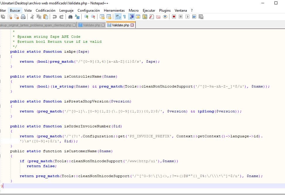 gusman126 Posted April 21, 2019 Author Share Posted April 21, 2019 (edited) Video explicando como hacer los cambios. ANTES HACED COPIA DE TODA LA CARPETA Y ESOS FICHEROS Necesario acceder a los ficheros sea por filezilla o usando el explorador de archivos del servidor de hospedaje Os recuerdo que no soy responsable de los fallos o errores producidos al editar estos ficheros Aquí el código que hay que poner en validate public static function isCustomerName($name) { if (preg_match(Tools::cleanNonUnicodeSupport('/www|http/ui'),$name)) { return false; } return preg_match(Tools::cleanNonUnicodeSupport('/^[^0-9!\[\]<>,;?=+()@#"°{}_$%:\/\\\*\^]*$/u'), $name); } Edited April 22, 2019 by gusman126 (see edit history) 1 Link to comment Share on other sites More sharing options...