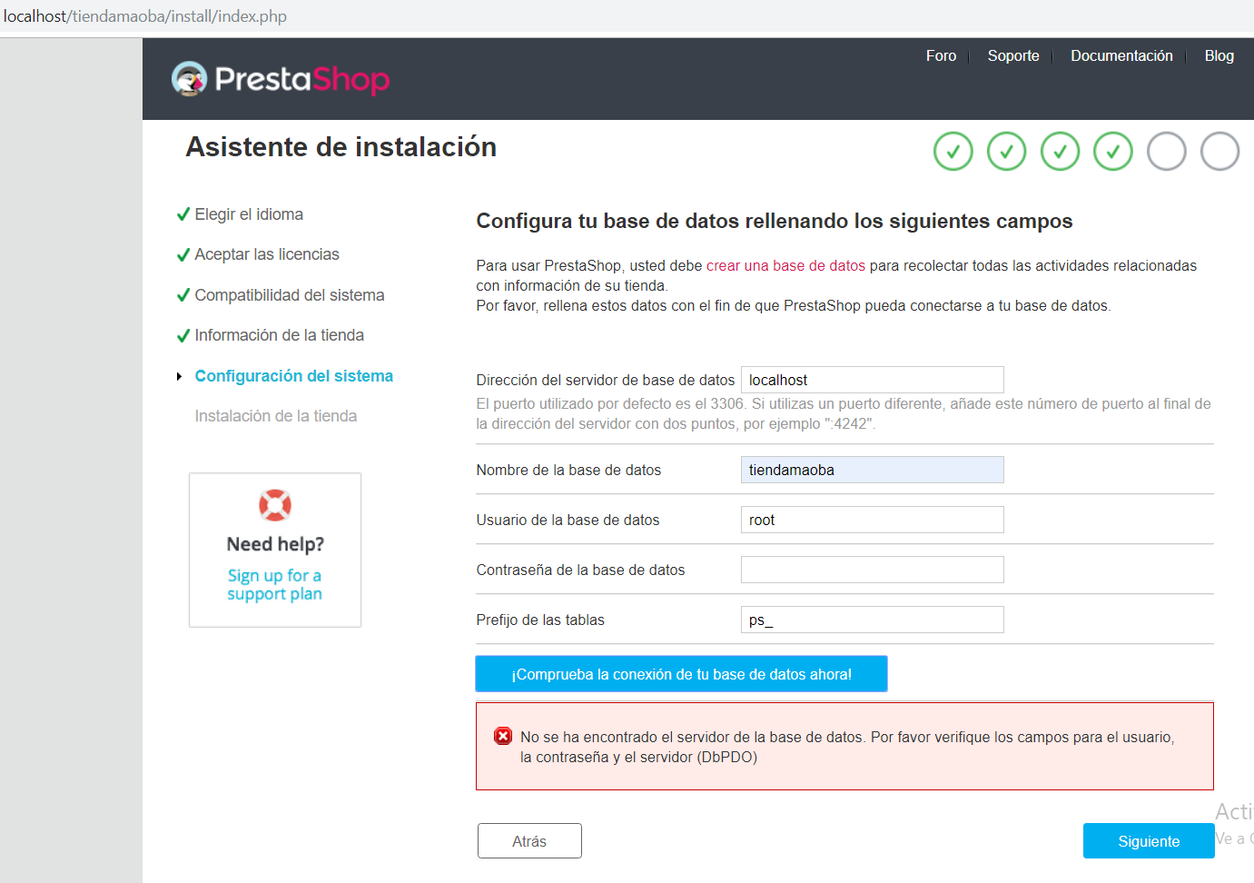 Tengo problemas con la instalación, me arroja un error "No se ha encontrado el servidor de la base de datos. Por favor verifique los campos para el usuario, la contraseña y el servidor (DbPDO) y he visto soluciones y tutoriales y no pasa nada sigo con el error. por favor ayuda, adjunto algunas imágenes que dan orientación de lo que he hecho.