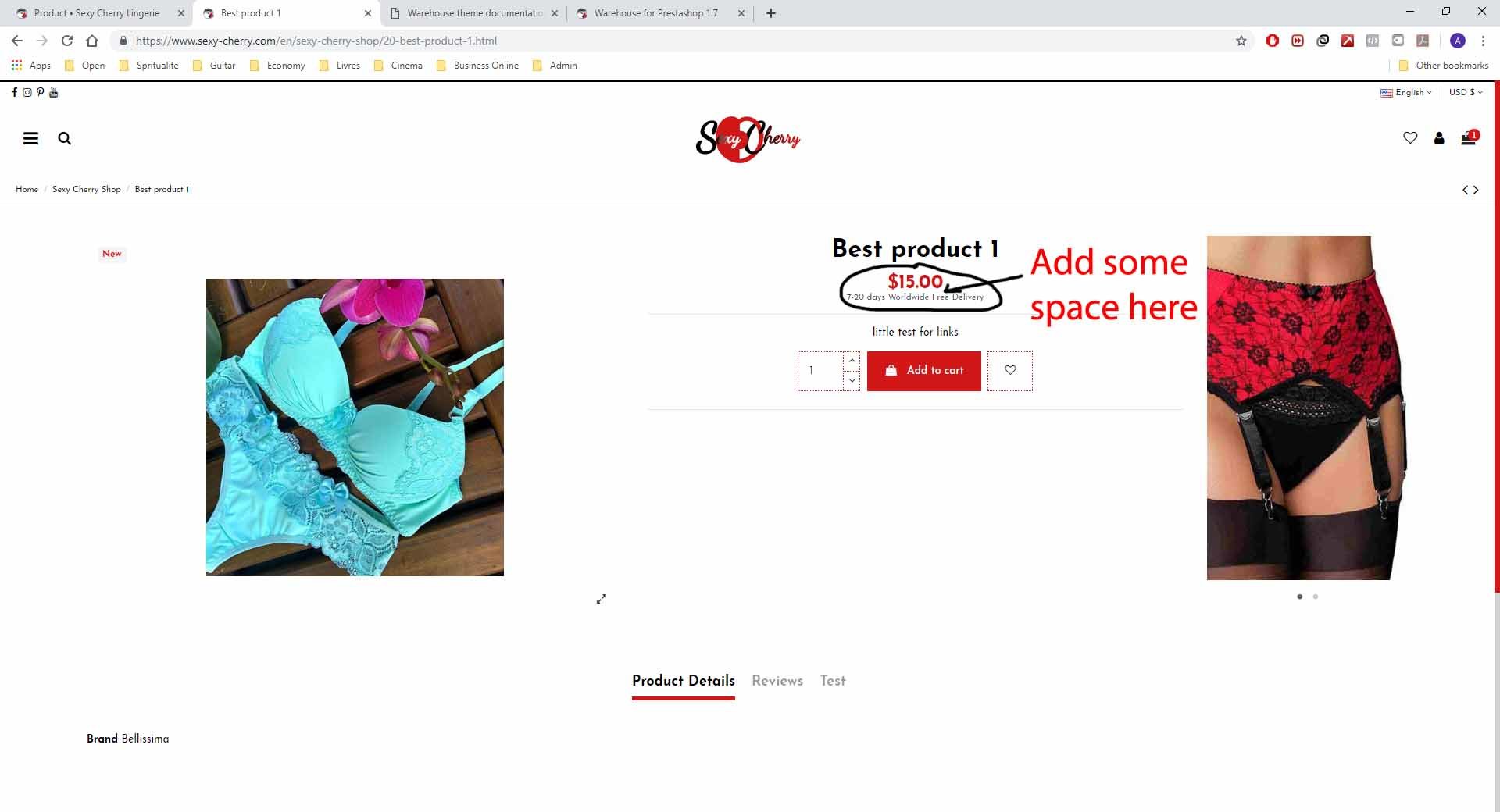 superskyman100 Posted April 24, 2019 Share Posted April 24, 2019 (edited) Hello Community, Id' like to add some space here 1 - i am completely unable to find WHERE i did put the '7-20 days Worldwide free delivery' into the Prestashop BO (already searched one hour....) 2- i don't know how i could add some space there (maybe on simple CSS line ?) Thanks a lot for your help Edited January 24, 2020 by superskyman100 (see edit history) Link to comment Share on other sites More sharing options...