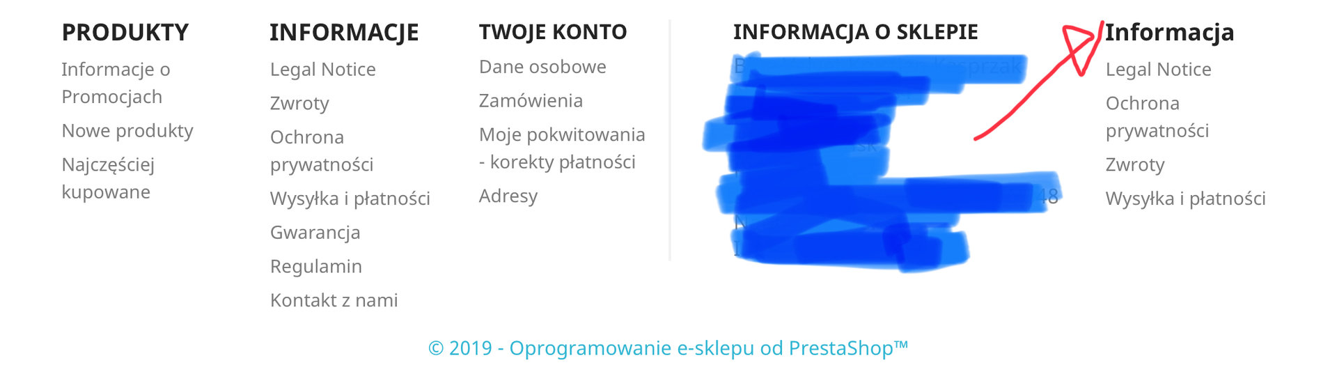 W stopce mojej strony z lewej strony mogę kontrolować co ma się wyświetlać itd. ale niestety z orawej strony są informacje o sklepie i zakładka informacja. Nie mogę nigdzie w ustawieniach znaleźć gdzie edytować tę zakładkę, nie mogę nic do niej dodać . Najchętniej bym ją usunął ponieważ jest mi zbędna bo mam już taką z lewej strony stopki. Załączam zdjęcie.