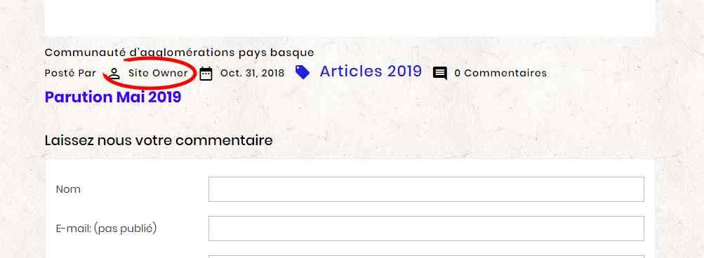 peio Posted May 3, 2019 Author Share Posted May 3, 2019 Il y a 2 heures, NemoPS a dit : Shop Parameters, contacts, store in 1.7 Hello, I haven't welle explained my problem! When you want to let a comment on the blog, you have some informations about the post. I have translated them in french as this: Posté par "site owner", 31 mars 2019 - commentaires. u look the picture below. I want to change "site owner" to "my name". I don't know where can I change it. Thanks a lot for helping. Link to comment Share on other sites More sharing options...