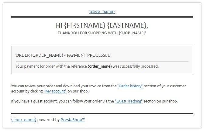 od 2 dni mam następujący problem, PrestaShop wysyłając powiadomienia np. o zamówieniu, płatności, wysyłce itp. nie wstawia danych w szablon wiadomości mailowej pozostają tylko treści i pola z niepostawionymi danymi. Dane nie działają całościowo, wszystkie zmienne są puste - treści, logo, linki do podstron. Wiadomość którą otrzymujemy np. dla potwierdzenie zamówienia wygląda tak jak na załączonym screenie ze skrzynki mailowej.