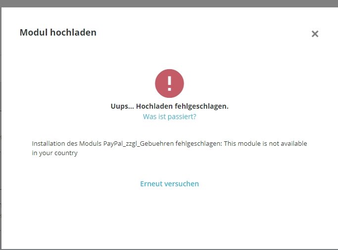 stempelgarten Posted May 15, 2019 Author Share Posted May 15, 2019 Musste das schon irgendwie installierte Rechtssicherheitmodul löschen per FTP. Danach habe ich es im Shop wieder zur Installation finden können. Jetzt aber das Problem mit den Modulen die ich installieren will und die Meldung erhalte: Installation des Moduls paypal_zzgl_gebuehren fehlgeschlagen: This module is not available in your country Wie kriege ich diese installiert? Denn es ging ja vorher auch. Plötzlich nicht mehr. Link to comment Share on other sites More sharing options...