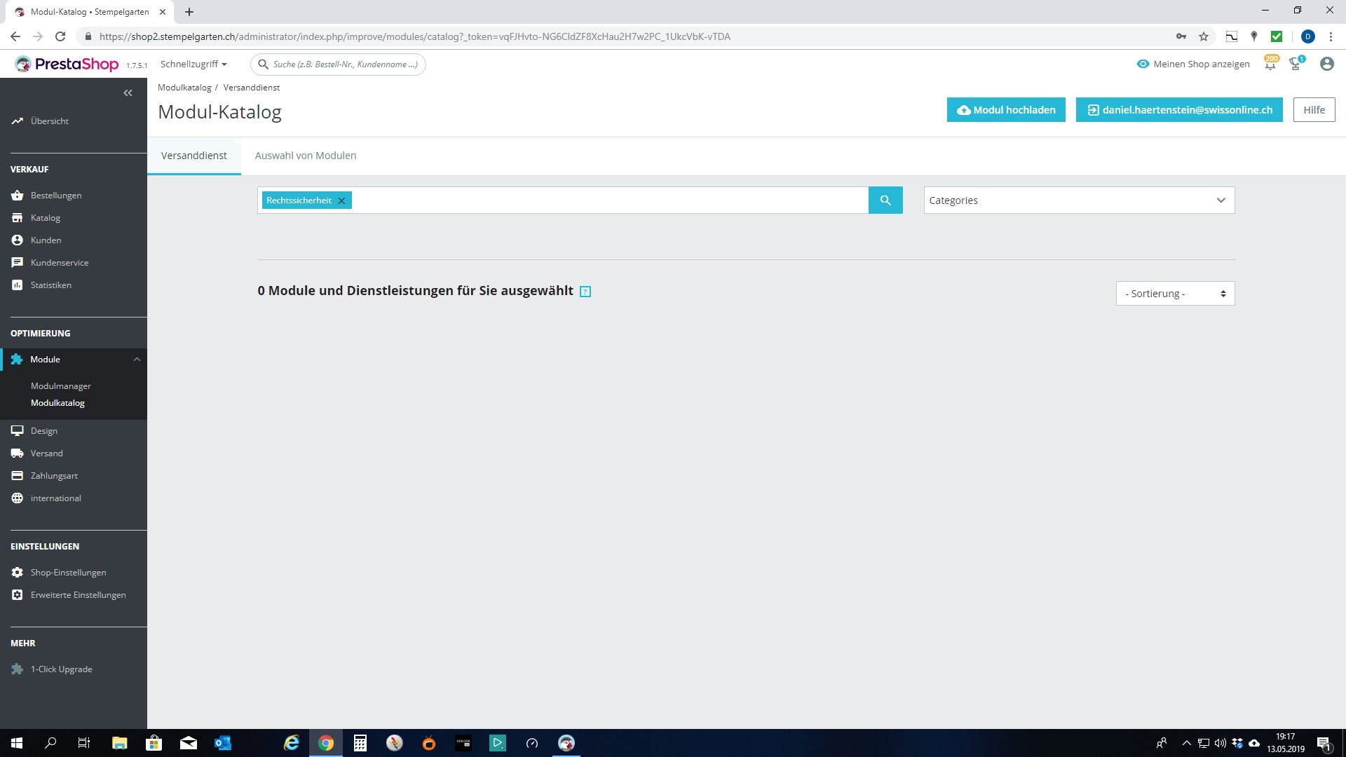 stempelgarten Posted May 10, 2019 Author Share Posted May 10, 2019 Merkwürdig ist aber, dass ich jetzt das Modul deutsche Rechtssicherheit nicht mehr im Modulkatalog zur Auswahl bekomme. Finde es nicht mehr. Egal ob mal installiert oder nicht, müsste es doch dort immer noch zu finden sein. Heute Morgen war es ja noch da. Link to comment Share on other sites More sharing options...