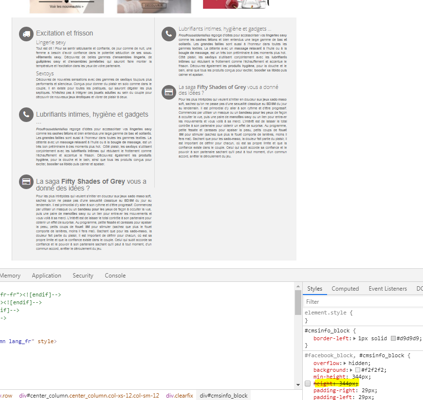 petinico Posted May 8, 2019 Author Share Posted May 8, 2019 Bonjour Eolia, Alors dans le css du thème/modules, j'ai pas le module blockcmsinfo ... Ce que je comprends pas c'est qu'avec firebug, avant j'avais un lien qui indiquait où se trouvait l'info, maintenant ça ne s'affiche plus. bizarre Pour le lien c'est https://www.froufrousetdentelles.com/ merci Link to comment Share on other sites More sharing options...
