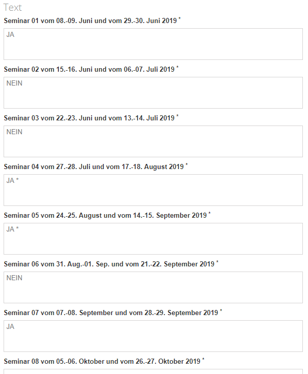 Bei einem Seminar oder Kurs muss ich aber vom Kunden mehrere Terminmöglichkeiten haben, welche er mitteilen kann, damit ich den Kunden dann in einem der möglichen Termine einteilen kann. Kann schlecht von im verlangen, dass er den Kurs mehrmals buchen muss. Vielleicht hilft das beigelegte Bild zum Verständnis (So wie ich es bis jetzt realisieren konnte mit den Textfeldern). Nur stört es wenn der Kunde z.B. 6 oder mehr Felder jeweils mit Ja oder Nein ausfüllen muss. Da wären Checkboxen einfacher.