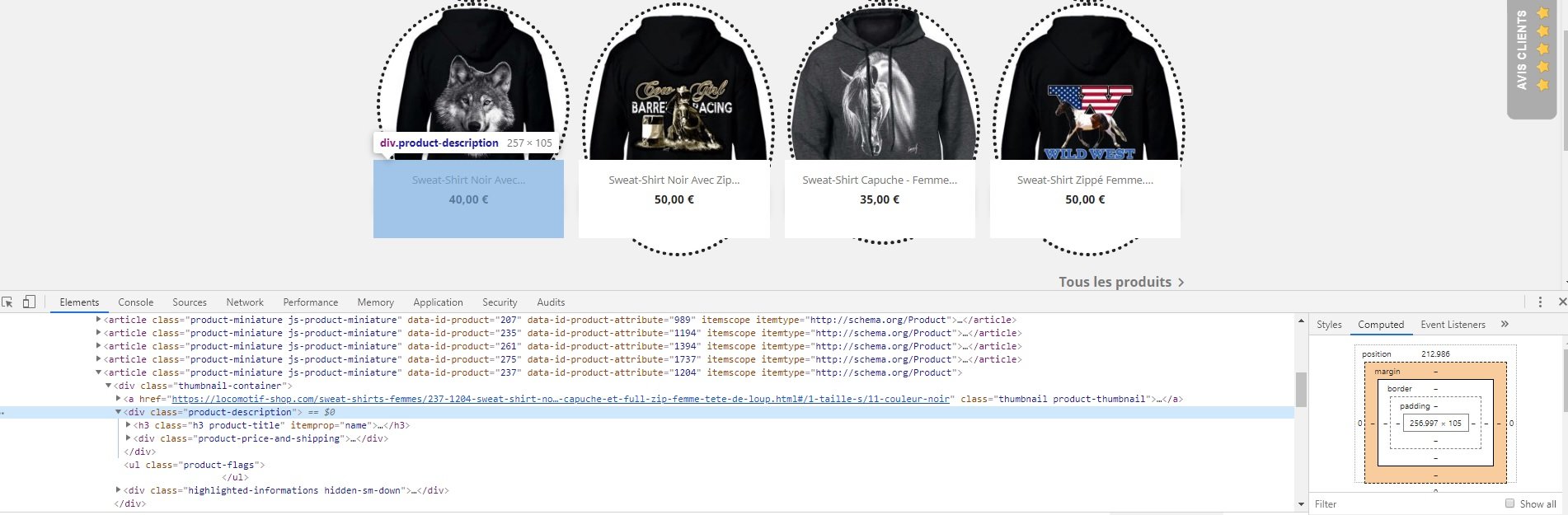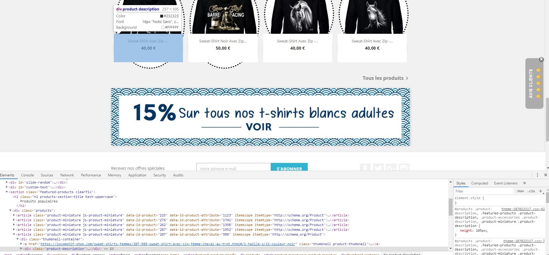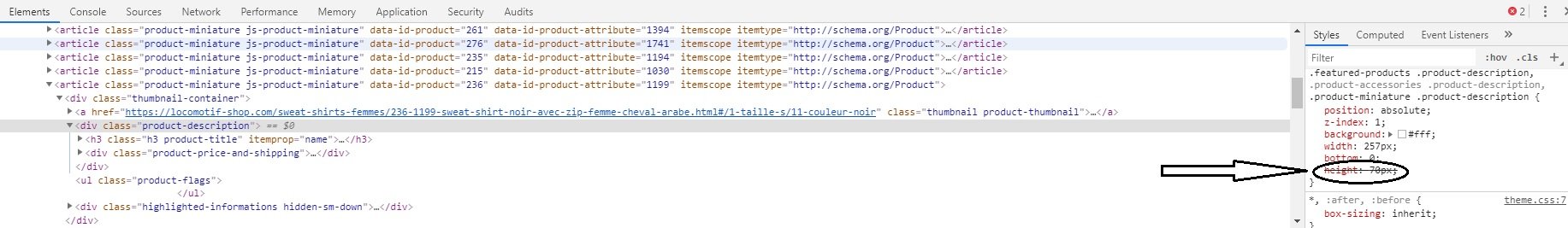 J'aimerai pouvoir réduire la hauteur du conteneur "product-description" à 70 px qui est actuellement à 105 px, mais je n'arrive pas à trouver la ligne correspondante. J'ai regardé dans le fichier "thème .css".